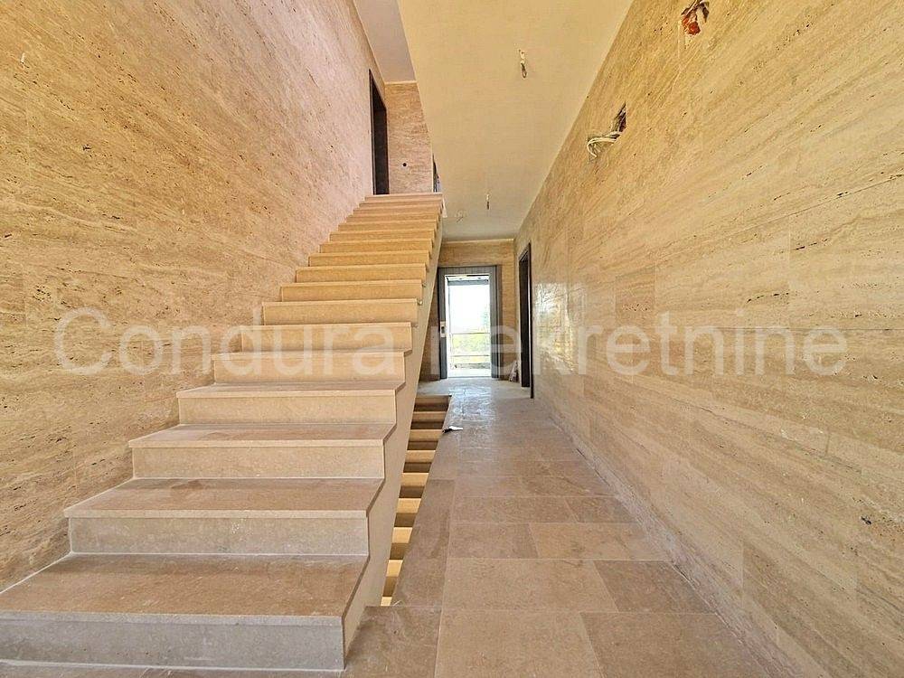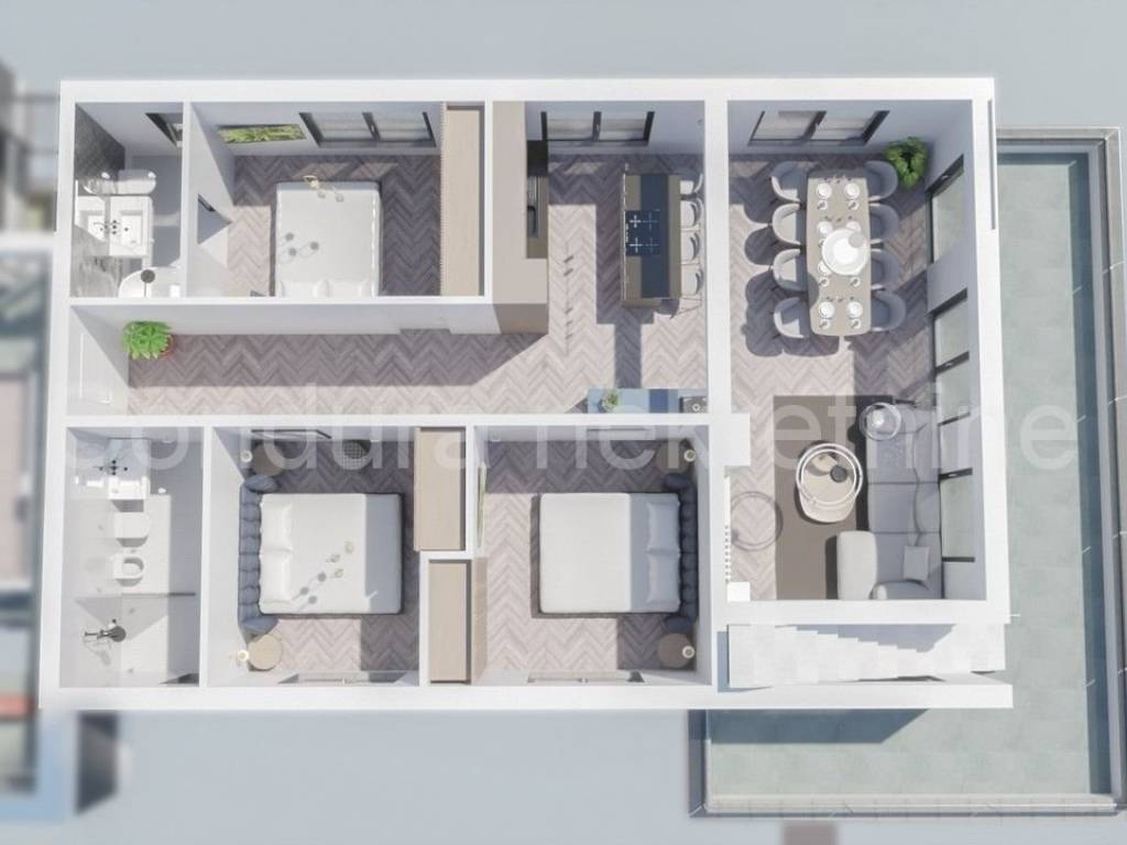 From the living room and dining room there is a balcony with an area of 26.78 m2, from which an external staircase leads to a large roof terrace with an area of 102.29 m2, which has a view of the sea.