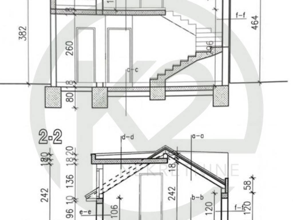 Tlocrt se sastoji od ulaznog hodnika, zasebnog WC-a, praonice, kupaonice sa WC-om, prostranog dnevnog boravka sa kuhinjom i blagovaonicom, spavaće sobe sa vlastitom kupaonicom te druge spavaće soba za garderobom, stubišta koje vodi u potkrovlje koje je visine 240cm do najvišlje točke.