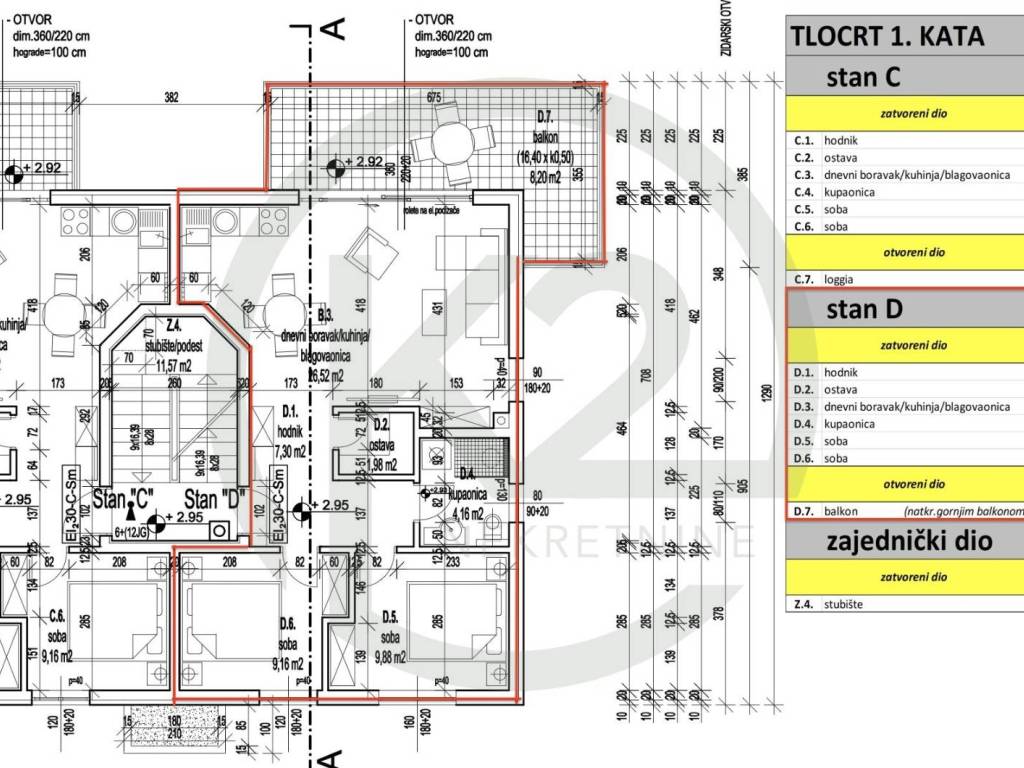 Predmetni stan oznake D nalazi se u prizemlju zgrade te se sastoji od ulaznog prostora, kupaonice sa WC-om, dnevnog boravka sa kuhinjom i blagovaonicom, dvije spavaće sobe terase i ostave.