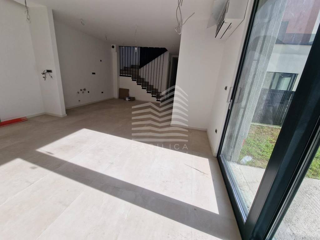 Kuća je kompletno sagrađena, nalazi se završnoj fazi dovršavanja okoliša i unutarnjeg opremanja. Iznimna kvaliteta gradnje; dvojna je i poluugrađena; nosiva protupotresna konstrukcija kombinacija armiranog betona i najmodernijeg načina zidanja termo blok opekom. Nosiva konstrukcija i međukatna ploča kuće je armirano-betonska, krov zgrade je ravni s betonima u padu, a fasada toplinski izolirana staklenom vunom. Velike staklene plohe daju obilje svjetla.