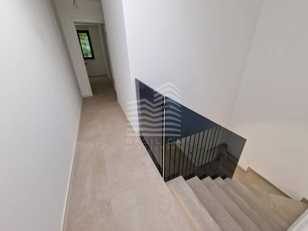 Prizemlje je povezano stepenicama obučenim u bjeli kamen sa uvučenim katom koji se sastoji od: hodnika, stubišta, kupaonice, tri spavaće sobe.