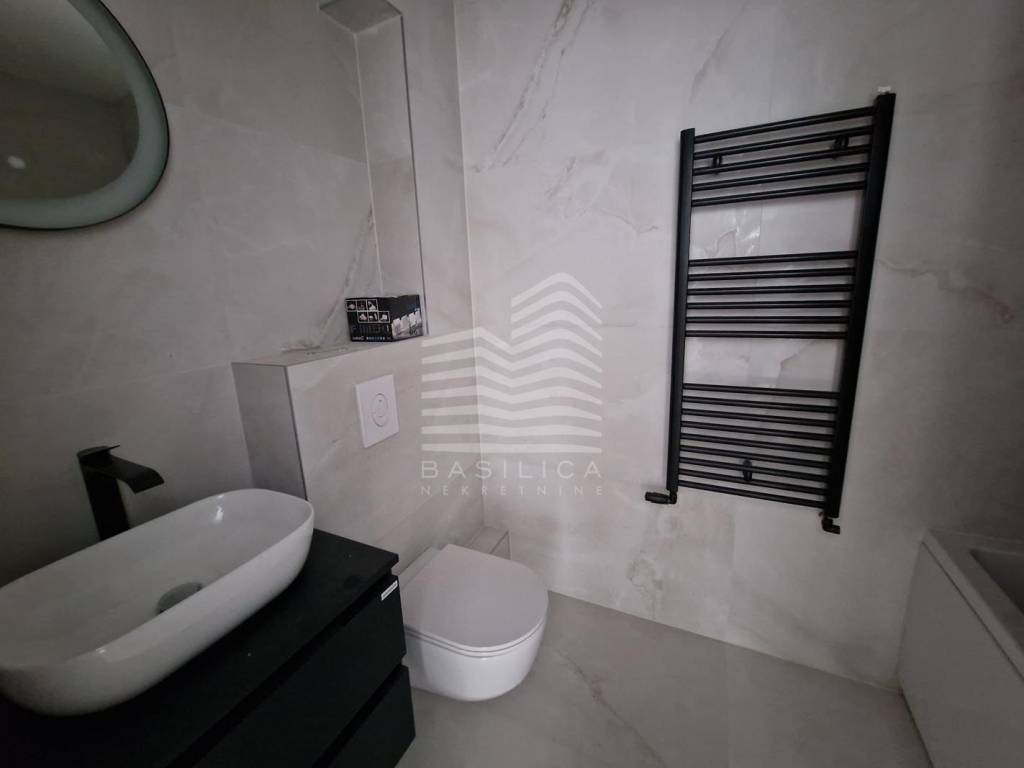 Keramičke pločice u stanu su toplih boja i telijanskog dizajna, većih dimenzija i visoke kvalitete. Sanitarije su Villeroy & Boch; ležeća kada na katu i Walk in tuš u prizemlju sa staklenom stijenom kabine, ugradbena viseća WC školjka.
