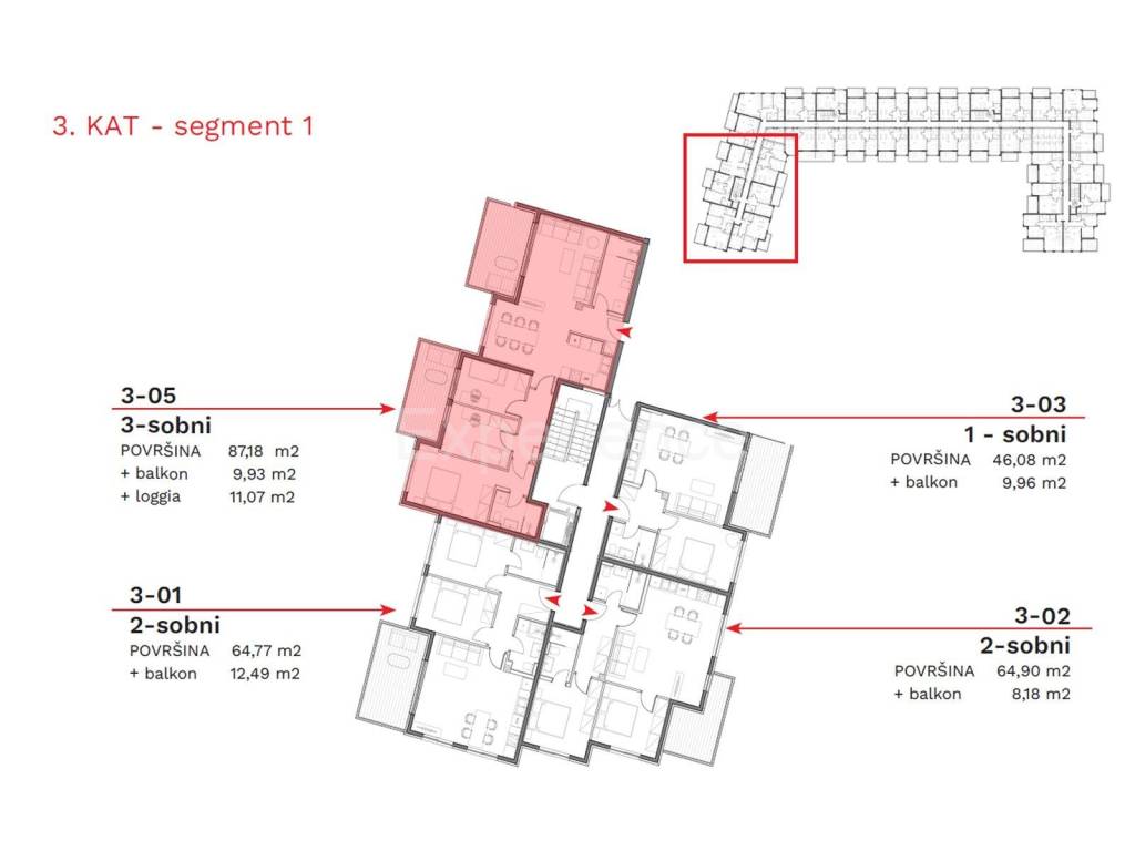 On sale is an apartment situated on the third floor of the building, surface of 102,93 m. Contains: entrance hall, an open and bright space in which there is a living room, dining room and kitchen with access to a spacious balcony (11,07 m), three bedrooms - two of which have access to a balcony (9,93 m) and two bathrooms. The apartment also has a storage room (3,44 m), two outdoor parking spaces and a garage parking space.