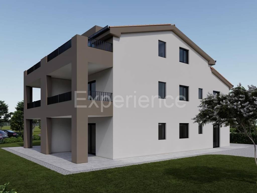 Nearby Poreč - cca. 9 km from the sea and the city, in a quiet environment there is an apartment in construction, surface of 65,60 m. The apartment is situated on the first floor of an intimate residential building with only 5 residential units. Contains: entrance hall, living room, kitchen and dining room with access to a spacious covered terrace (9,56 m), two bedrooms, one of which has access to a covered terrace (5,60 m) and a bathroom.