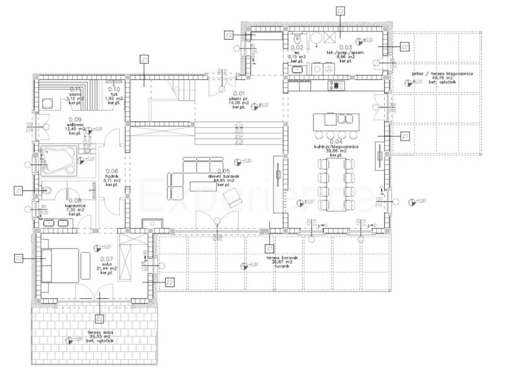 Spreading over an impressive 306 m over two floors, the villa is carefully designed to maximize comfort. The ground floor features a bright and airy living room with plenty of natural light, with direct access to a spacious terrace (36.87 m). A modern kitchen and dining area create an ideal space for gatherings, while the master bedroom with en-suite bathroom, dressing room and its own wellness corner provides a luxurious private retreat. There is also a sauna with shower, a guest toilet and a technical room with a laundry room.