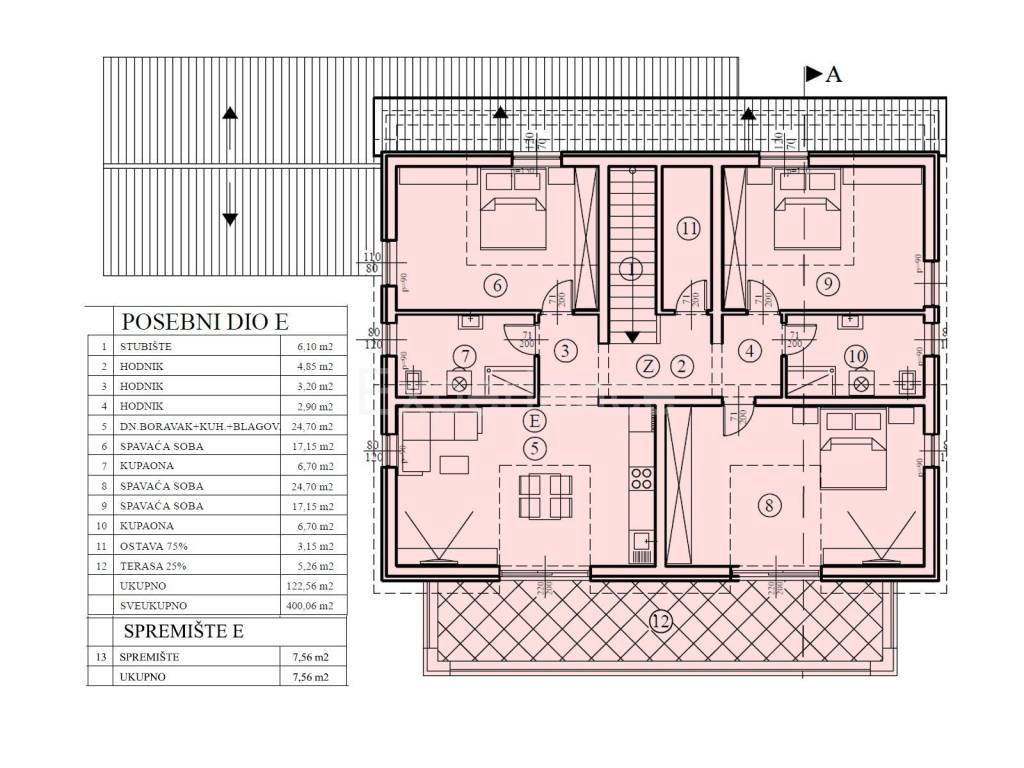 Nearby Poreč - cca. 9 km from the sea and the city, in a quiet environment there is an penthouse in construction, surface of 122,56 m. The penthouse is situated on the second and last floor of an intimate residential building with only 5 residential units. Contains: entrance hall, open and bright space in which there is a living room, kitchen and dining room with access to a spacious terrace (21.04 m), three bedrooms, two bathrooms and a storage room (3.15 m).