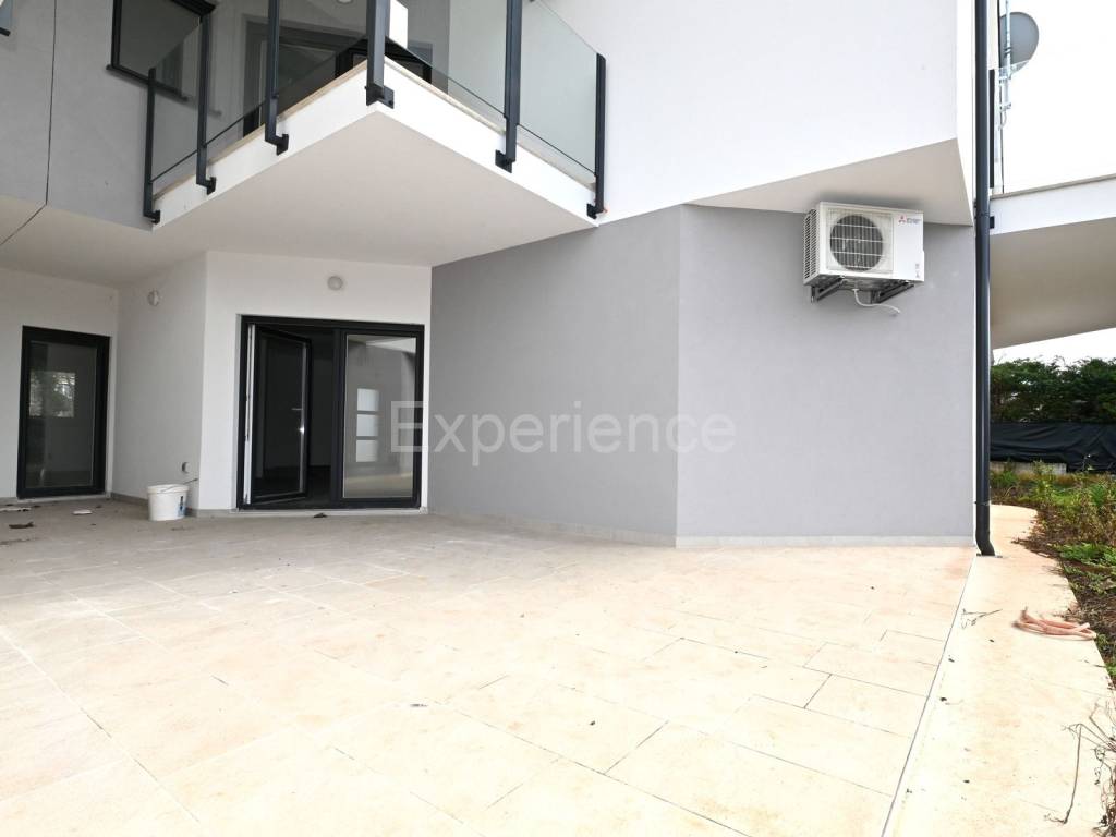 Savudrija - approx. 500 m from the beach, in a very quiet environment there is a three-room apartment for sale in a new building, with area of 64,20 m. The apartment is situated on the ground floor of a residential building with a total of 8 residential units. Contains: entrance hall, an open and bright space where are situated a living room, kitchen and dining room with access to the terrace, two bedrooms and bathroom. The apartment also has a garden (approx. 150 m), garage (12.10 m) and storage room (10 m) in the basement of the building.