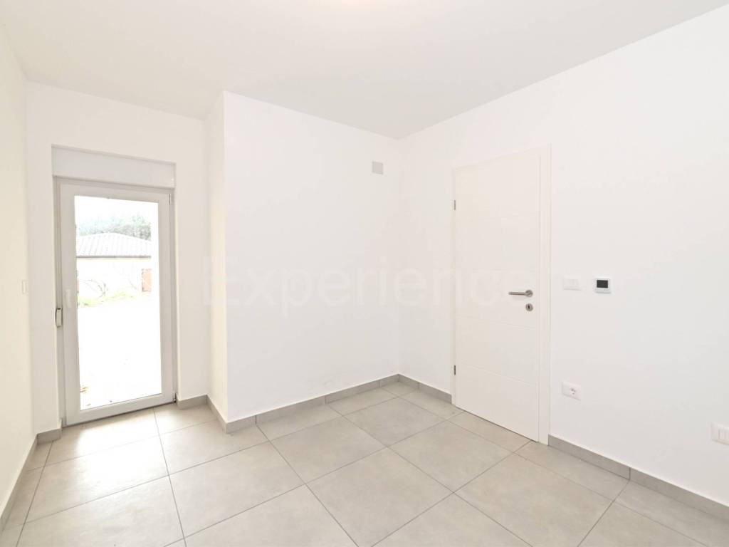 Savudrija - approx. 500 m from the beach, in a very quiet environment there is a three-room apartment for sale in a new building, with area of 63 m. The apartment is situated on the ground floor of a residential building with a total of 8 residential units. Contains: an open and bright space where are situated a living room, kitchen and dining room with access to a covered terrace, two bedrooms and bathroom. The apartment also has a garden (approx. 50 m), garage (12.10 m) and storage room (9.60 m) in the basement of the building.