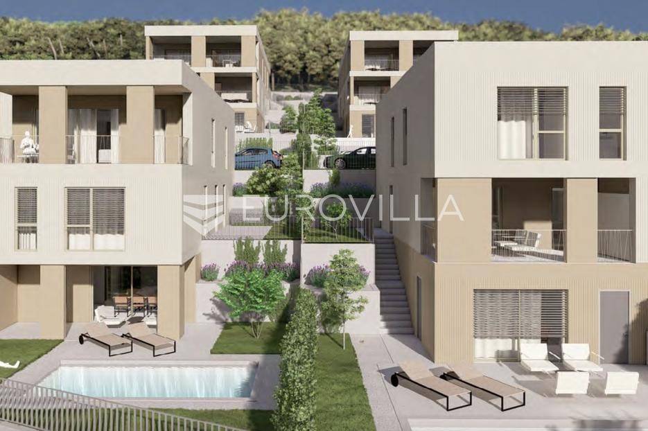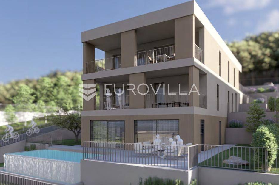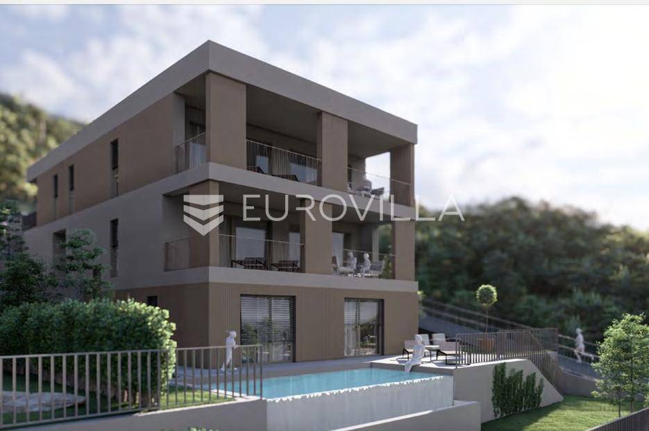 U Kostreni, jednoj od najljepših i najtraženijih lokacija na Kvarneru, prodaje se luksuzan četverosoban stan dvoetažan stan površine 251,58 m² u modernoj zgradi s ukupno dva kata. Ova elegantna novogradnja predstavlja savršen spoj sofisticiranog dizajna, udobnosti i suvremenog načina života, uz predivan pogled na more koji oduzima dah.Stan se sastoji od prostranog dnevnog boravka i blagovaonice površine 40,92 m², povezane s moderno uređenom kuhinjom od 7,79 m². Na raspolaganju su pet prostranih spavaćih soba (9,17 m², 19,20 m², 14,36 m², 18,35 m² i 14,60 m2), tri elegantne kupaonice,toaleta garderobe, praone, spremište, izba, hodnik i ulazni prostor. Natkrivena terasa od 25,74 m² pruža dodatni prostor za uživanje na svježem zraku uz mir i prekrasan pogled na more.Dodatno, stanu pripada privatni bazen, dvije vanjske terase s vrtom, dva vanjska parkirna mjesta te zasebno spremište površine 6,48 m².Poseban naglasak stavljen je na vrhunsku kvalitetu gradnje i odabir materijala. Stan je opremljen podnim grijanjem putem dizalice topline, klima uređajima, aluminijskom stolarijom ALU BEN, protuprovalnim vratima te vrhunskom završnom obradom. Zahvaljujući smart home sustavu, omogućena je potpuna kontrola svih funkcionalnosti doma, što dodatno doprinosi udobnosti i sigurnosti stanovanja.Ova jedinstvena nekretnina pruža vrhunsku kvalitetu života uz privatni bazen i uređeni vrt, savršene za opuštanje i rekreaciju. Udaljenost od mora iznosi svega 1.118 metara, što osigurava brz i jednostavan pristup prekrasnim plažama i šetnicama. Završetak izgradnje planiran je za 2026. godinu.Stan se prodaje po principu „ključ u ruke“, bez namještaja. U cijenu je uključen PDV, a kupac je oslobođen plaćanja poreza na promet nekretnina.Ne propustite priliku postati vlasnikom ove iznimne nekretnine koja spaja luksuz, mir i blizinu mora - savršene karakteristike za moderan i kvalitetan život u Kostreni.Za više informacija i razgled stana, slobodno nas kontaktirajte.