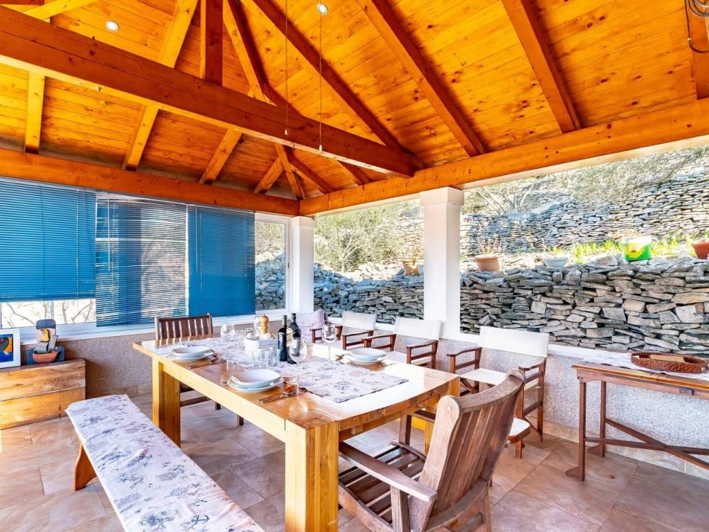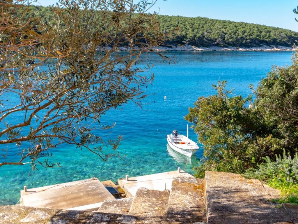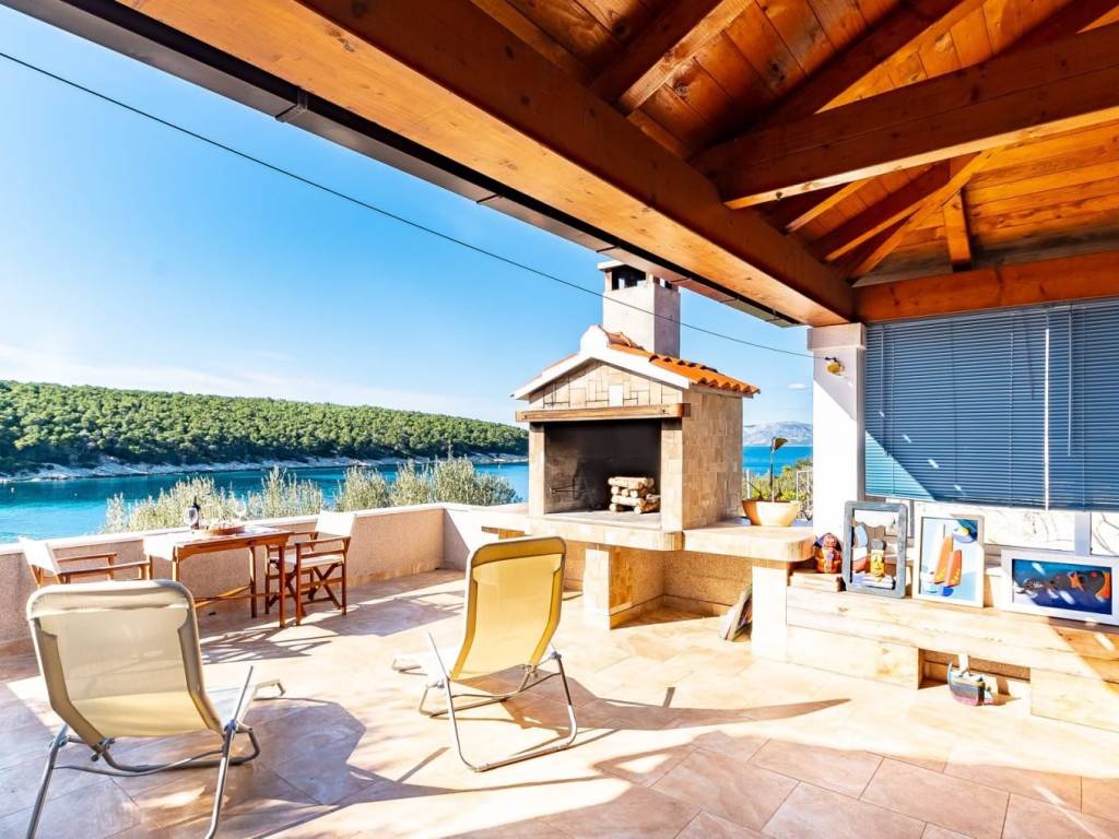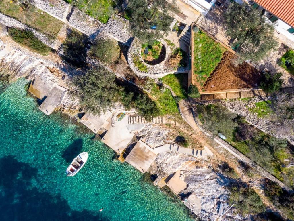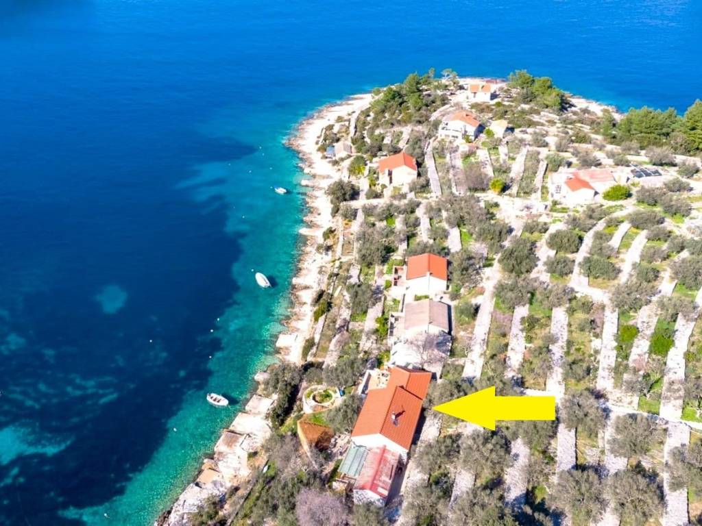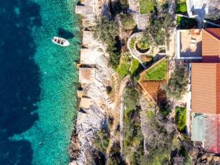 Kuća ukupne površine 134 m2, smještena prvi red uz more u fantastičnoj uvali na sjevernoj strani otoka, u blizini Vele Luke, s kristalno čistim morem, koja se sastoji od suterena u kojem se nalazi gustirna i spremište te kata na kojem je trosobni stan i velika dijelom natkrivena terasa s kaminom, potpuno renovirana, namještena i opremljena, zapadne orijentacije, priključak struje, septička jama, naslonjena na susjednu manju kuću, bez direktnog prilaza autom - pješački pristup stepenicama (70 m) od kolnog prilaza iznad uvale, pravo korištenja dva mula ispod kuće, lijepo uređena okućnica, rijetko na tržištu.