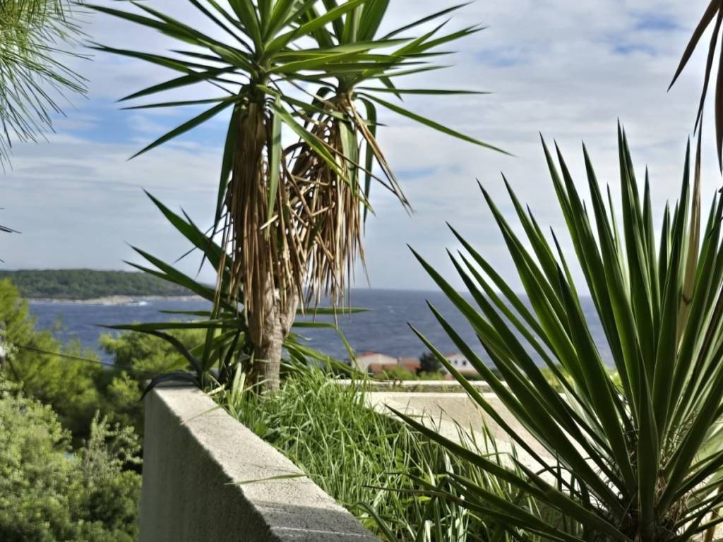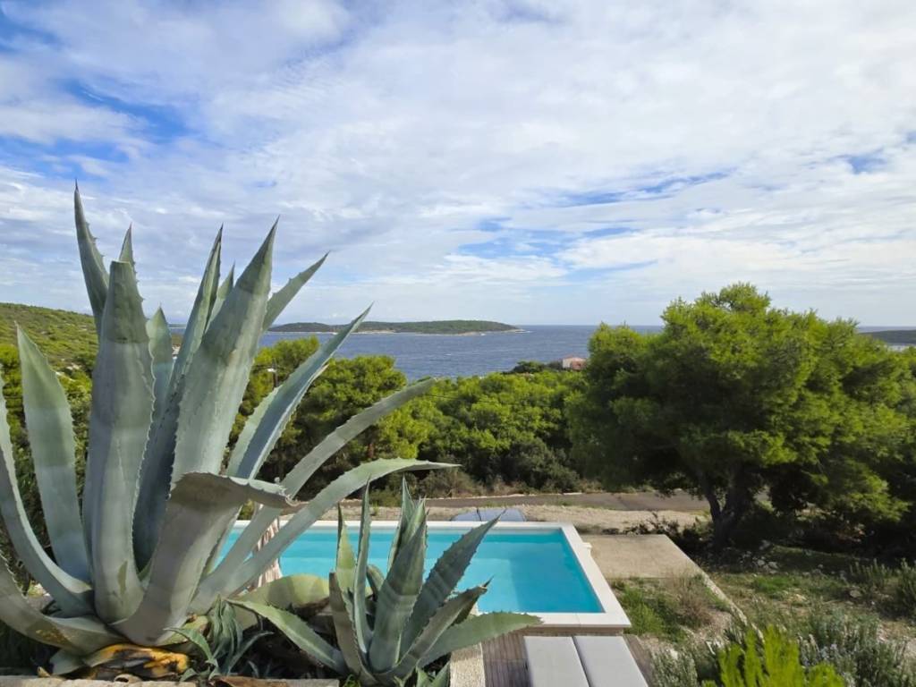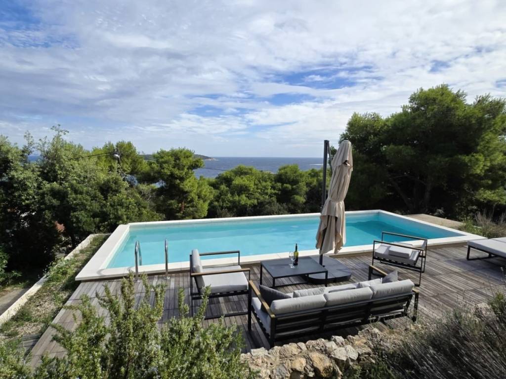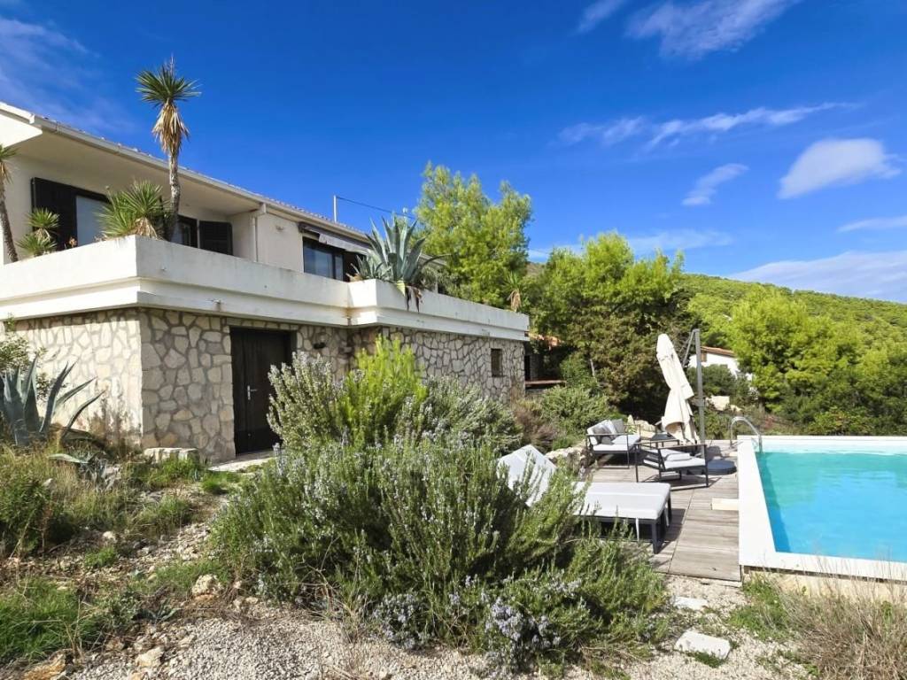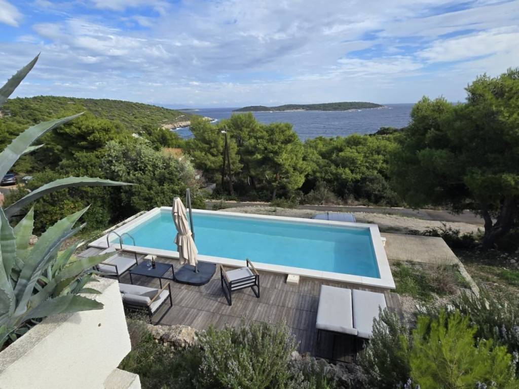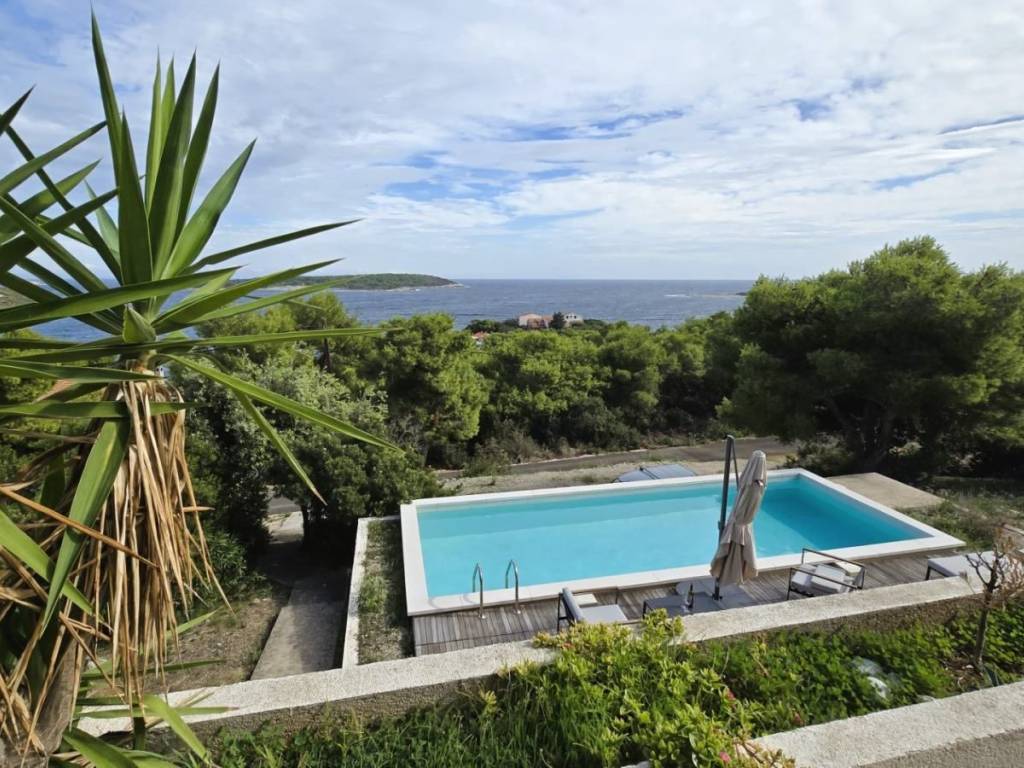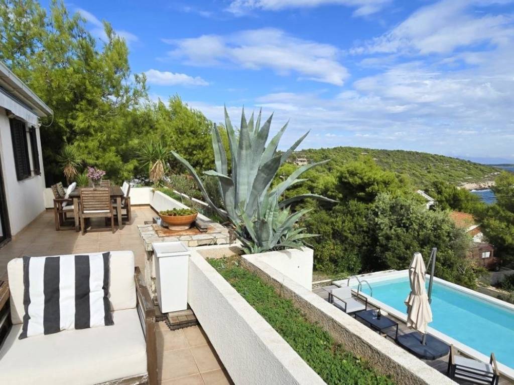 Lijepa trosobna komforna kuća površine 120 m2, smještena na prekrasnoj lokaciji u mjestu Brgujac na jugoistočnoj strani otoka Visa, na zemljištu od 860 m2, koja se sastoji od tri spavaće sobe, kuhinje s blagovaonicom i dnevnim boravkom, dvije kupaonice i velike terase sa otvorenim pogledom na more te dodatnom velikom donjom terasom s bazenom, ostava u podrumu, vanjski kamin, prilaz autom i veliki parking, potpuno namještena i opremljena, udaljena od mora cca 120 metara.