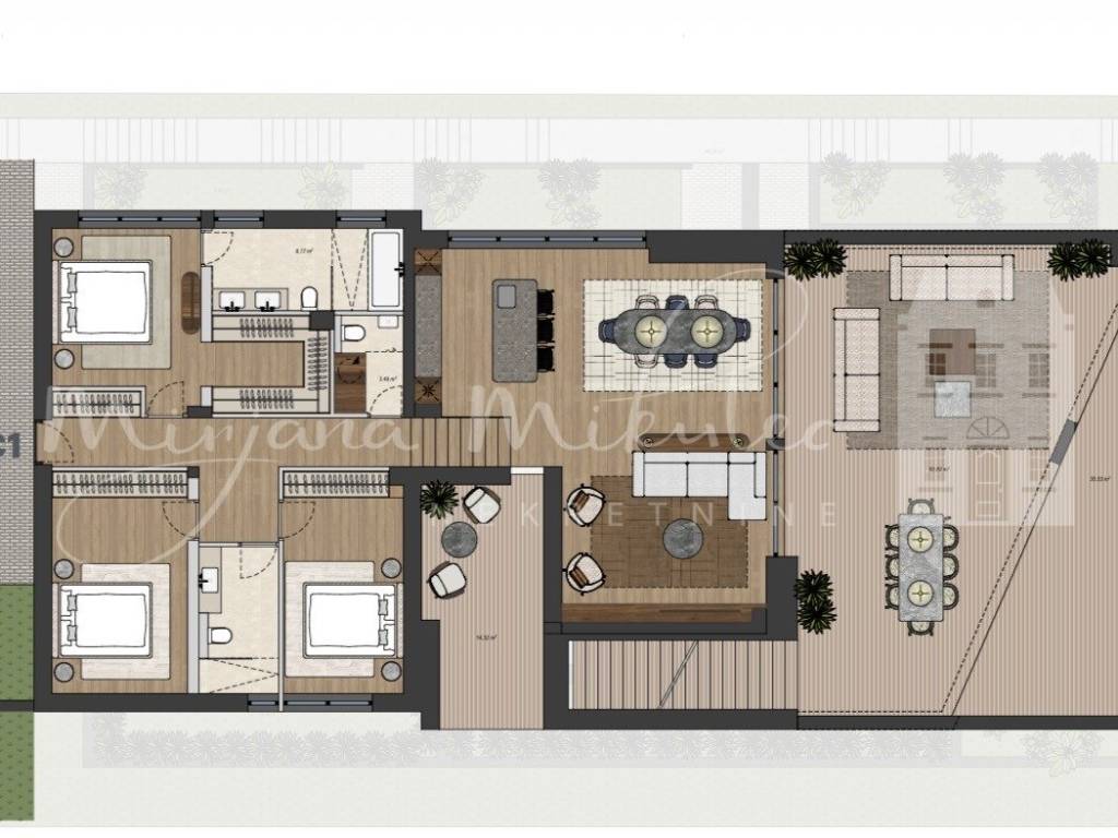 Penthouse- zatvorenog stambenog prostora ima 135 m2, i čine ga: 3 spavaće sobe, jedna sa vlastitom kupaonom i walk in ormarom, kupaona, te par stepenica niže nalazi se loggia (14.32m2) i dnevni dio otvorenog koncepta ( 56.19 m2) iz kojeg se izlazi na natkrivenu terasu 62.62 m2 te nenatkriveni dio terase ( 35.53 m2).