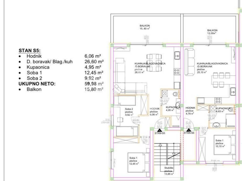 We are mediating the sale of a two-room apartment on the second floor of a new building in Okrug Gornji (label "S5").
