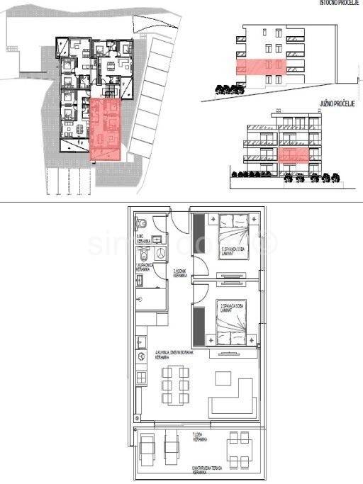 Apartments for sale in an exceptionally high-quality new building of a renowned company. The building is located in a quiet street, yet only 350m from the pebble beach and the center of Primosten. Apartment S8 is placed on the first floor of the building and, with coefficients included, has a total net usable area of 64.84 m2, and it also has one outdoor parking space included in the price. The apartment consists of a hallway, bathroom, toilet, two bedrooms, kitchen and living room with dining room, from which there is an exit to the terrace with a sea view. As part of the common part of the garden, all owners will have the opportunity to enjoy the garden with a barbecue. The building was designed to meet energy class A with a facade system made of EPS polystyrene 15cm thick, while the partition walls have increased sound insulation. There is also REHAU Synego PVC joinery, three-layer IZO glass, electric motor-driven roller shutters and mosquito nets in the window shutter box. Entrance door to the apartment in anti-burglary and fire-resistant design, first-class ceramic tiles from Italian manufacturers in the bathroom, kitchen, living room, hallway and loggia. High-quality laminate class 33, 12 mm thick in bedrooms. TV and internet sockets are provided in all rooms. All rooms are equipped with PANASONIC / inverter air conditioners / Wi-Fi mode with a 10-year warranty on the entire air conditioning system and a digital thermostat. Buyers are exempt from real estate sales tax.