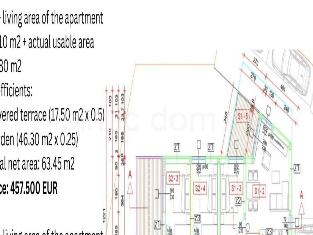We are mediating the sale of a very high-quality and luxurious new construction in Sevid, an increasingly popular choice for buyers looking for peace and privacy. It is a complex of three buildings with a total of 16 apartments. Apartment S1 is placed on the ground floor of the building and has a sales area of 63.45m2. The apartment itself consists of a bedroom, living room, bathroom and a spacious living room with kitchen and bathroom. However, the biggest advantage of the apartment is the large garden with a covered terrace, from which you can see the sea. The buildings are very functional and modernly designed, and each apartment is characterized by exceptional quality of construction and final equipment: top-quality ceramics, carpentry, floor coverings... We emphasize that the owner is a legal entity and there is no obligation to pay 3% real estate tax, and one outdoor parking space is included in the price. Ownership is in order.