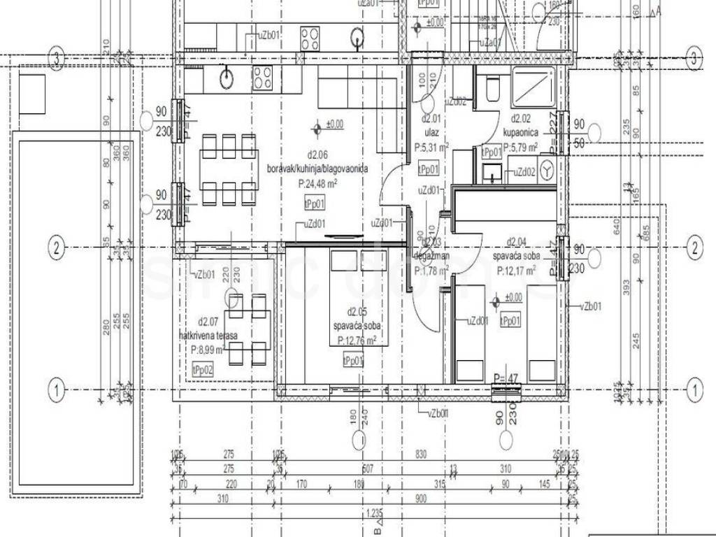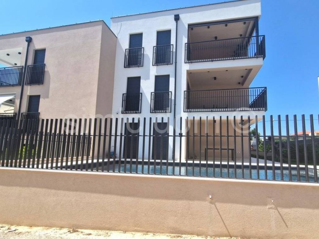 A beautiful new apartment is for sale in Bibinje, close to the beach and all amenities. The building is being built by a reputable company, so there is no real estate tax, and it is also possible to buy on credit. The building is being built to the highest European standards, using exceptionally high-quality materials. Apartment S2 is located on the ground floor of a smaller building, and has a total area of 71.8 m2, or 66.79 m2 of net usable area. The apartment consists of a hallway, bathroom, two bedrooms, an open-concept kitchen with a dining room and a living room that opens onto a beautiful garden with a swimming pool. An outdoor parking space is included in the price. All apartments will be excellently equipped: underfloor heating throughout the apartment for maximum comfort, air conditioning in all rooms, Rehau joinery with triple glazing, mosquito nets and electric shutters, interior doors with hidden hinges and magnetic locks, anti-burglary and fire-resistant entrance doors for additional security, video intercom and video surveillance of the common courtyard and parking lot, thermal insulation of the facade with 10 cm polystyrene. Another apartment with a swimming pool on the ground floor with an almost identical layout, but larger proportions, with a usable area of 80 m2, is also for sale for 350,000. The expected completion of the works is the end of 2026. Bibinje is a Mediterranean town located right on the coast, known for its beautiful beaches, authentic Dalmatian ambience and proximity to Zadar. The beach is only a 10-minute walk from the building, and in the immediate vicinity there are shops, restaurants, cafes, a pharmacy, a post office and other facilities necessary for everyday life. In nearby Sukosan there is the popular Marina Dalmacija, the largest marina on the Adriatic. There are excellent transport connections to the beautiful city of Zadar, which is only a few minutes' drive away, as well as the airport.