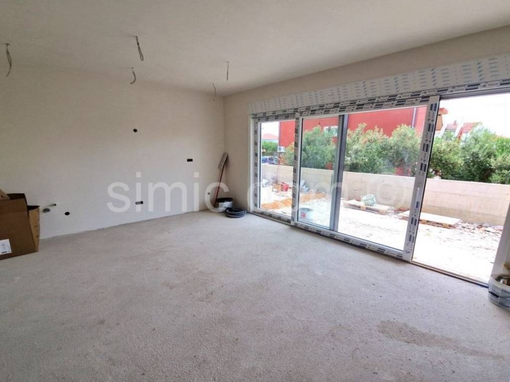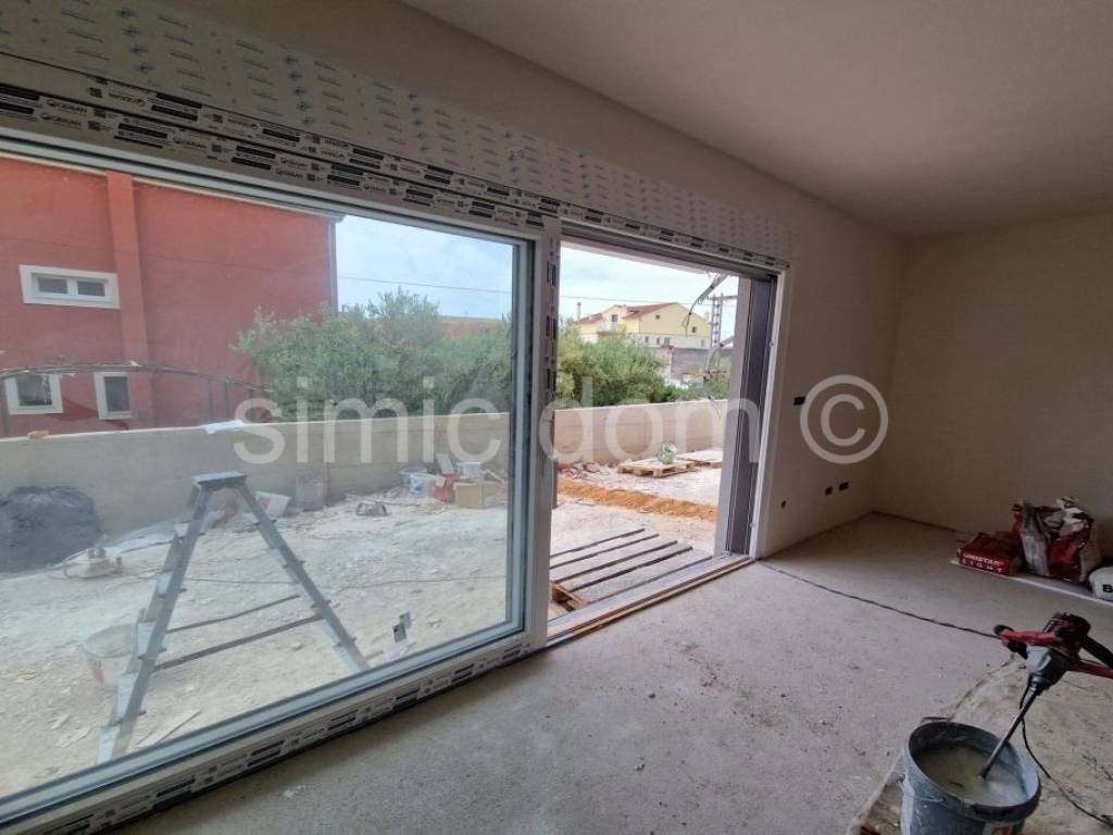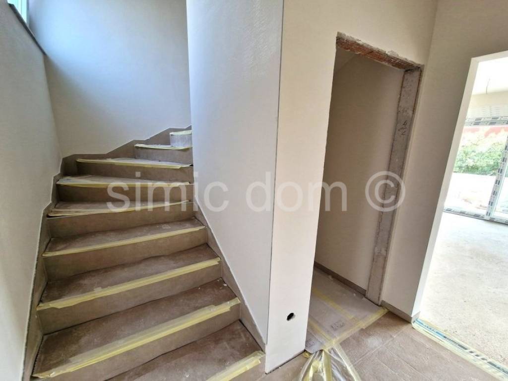 A terraced house for sale in a new building located just 200m from the beautiful pebble beach in Vodice. The house has a total area of 270 m2, or 136 m2 of net usable area, of which 100 m2 is interior space. It extends over two floors. On the ground floor there is an entrance area, a bathroom, and an open-concept kitchen with a dining room and living room, which leads to a beautiful garden of a total of 170 m2 of floor space, which also includes a sunbathing area and a jacuzzi, as well as a paved area with two parking spaces. An internal staircase leads to the first floor, where there are three bedrooms and another bathroom. This modern design property will be equipped according to the latest construction standards. Among the equipment, we highlight: 8 cm polystyrene facade, anthracite-coloured PVC windows and doors with built-in mosquito nets and roller shutters with an electric motor, quality ceramic tiles, quality laminate flooring in the rooms, Grohe bathroom fixtures, air conditioners with Wi-Fi control, underfloor heating in the bathrooms and living room, glass railings on the terraces, preparation for a jacuzzi in the garden... The planned completion date of construction is August 15, 2025. The prime location of this property will guarantee the owners a wonderful vacation near the beach and all other amenities of the town of Vodice, but also an excellent investment.