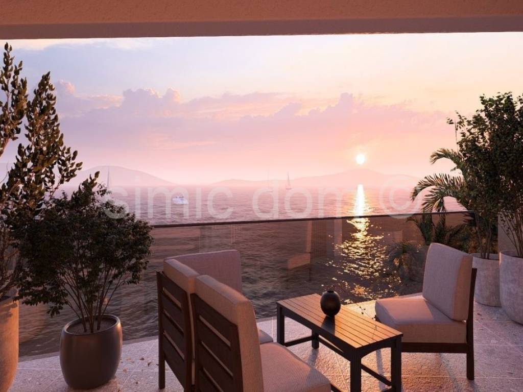 Top-quality apartments in the first row to the sea on Ciovo, from an investor who builds extremely high-quality real estate with excellent and modern design are for sale. The building is located in the most attractive area and in a quiet location right next to the turquoise blue sea and a beautiful beach. Two apartments are placed on the first floor, facing south and each has 69 m2 of floor space. They consist of a hallway, two bedrooms, a bathroom, a kitchen with a dining room and a living room that opens onto a covered terrace with a beautiful view of the sea and the Dalmatian islands. All apartments will be top-quality equipped, underfloor heating will be carried out throughout the apartment, all rooms are air-conditioned, aluminium windows, top-quality ceramics and sanitary ware, and the building will also have video surveillance. The building's courtyard will include parking spaces and beautiful Mediterranean vegetation. This is a top-quality property whose value will always be at a high level and which the owners will certainly enjoy. All amenities are nearby, and the airport is only 10 km away.