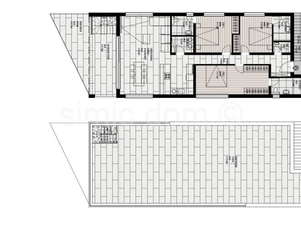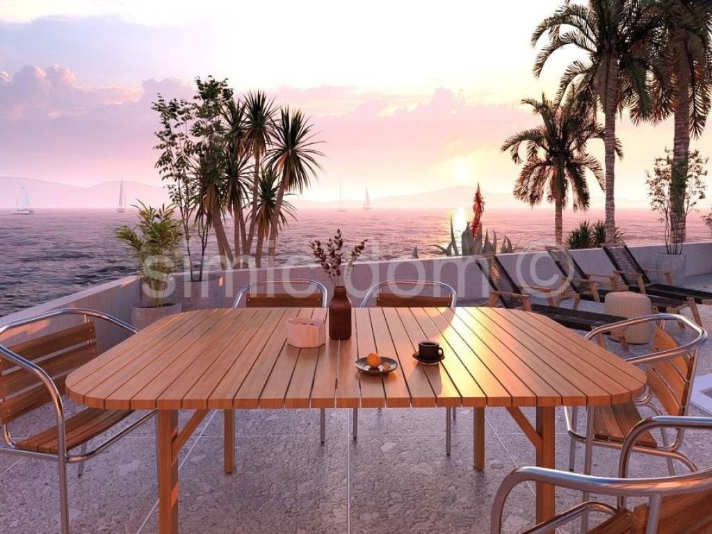 Modern penthouse apartment in a new building in the first row on Ciovo, from an investor who builds extremely high-quality real estate with excellent and modern design is for sale. The building is located in the most attractive area and in a quiet location right next to the turquoise blue sea and a beautiful beach. The penthouse apartment is placed on the second floor of a smaller building and has an internal area of 104 m2 and 3 more terraces, 2 at the apartment level and a large roof terrace. The terraces together have 154 m2 of floor space. With the coefficients included, the apartment has a net usable area of 147 m2. It consists of a hallway, 3 bedrooms - each with its own bathroom, and 1 with its own dressing room, a guest toilet, a laundry room, and a kitchen with a dining room and a living room from which you can exit to a terrace with a beautiful view of the sea and the Dalmatian islands. The penthouse has a complete roof terrace of 123.45 m with a view of the Dalmatian islands, which is ideal for a summer kitchen, hot tub, lounge and other facilities. It also has 2 outdoor parking spaces. Each apartment will have a separate entrance to the building, which provides privacy. All apartments will be superbly equipped, underfloor heating will be carried out throughout the apartment, all rooms are air-conditioned, aluminium windows, top-quality ceramics and sanitary ware, and the building will also have video surveillance. The building's courtyard will include arranged parking spaces and beautiful Mediterranean vegetation. This is a top-quality property whose value will always be at a high level and which the owners will certainly enjoy. All facilities are nearby, and the airport is only 10 km away.