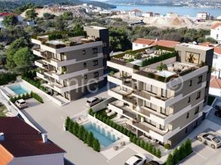 For sale is a spacious apartment in new construction in the southern part of Ciovo, only a 10-minute walk from the beach. The apartment designated as S7 is placed on the third floor of a building with an elevator and has a total internal area of 83m2, with a balcony of 24m2 floor area and a roof terrace of 109m2. From the roof terrace there is a spectacular panoramic view of the sea and the entire area of Okrug Gornji. Total net area of the apartment is 123m2, and it is sold with an external parking space. The apartment consists of three bedrooms, two bathrooms, a storeroom, a kitchen with a living room and a dining room with access to a spacious balcony. The building also has a common pool of 28m2. The building will be quality built with 10 cm thermal insulation; each apartment will be equipped with air conditioning and underfloor heating. Construction began in February, and occupancy is expected in May 2025.