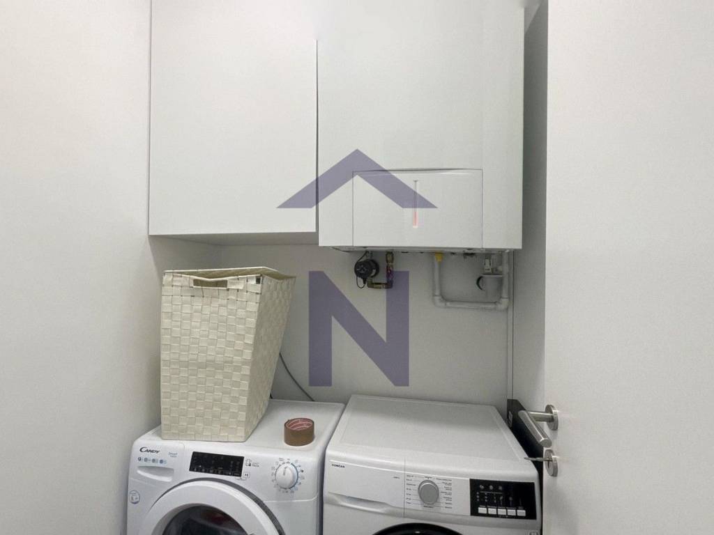 Opremljen je svim potrebnim aparatima - pećnica, perilica suđa, indukcijska ploča, hladnjak, perilica i sušilica rublja.
