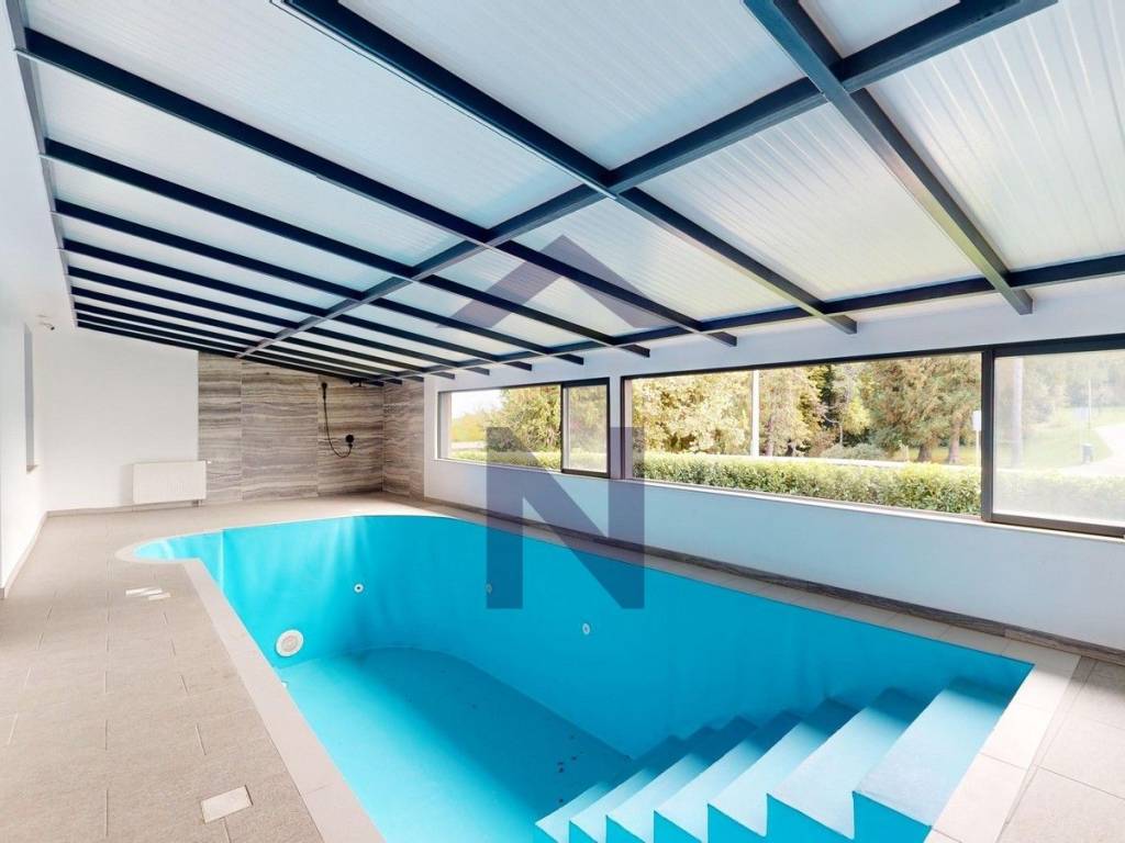 Ground floor: entrance hall, open-plan living room with kitchen and dining area, balcony, access to a terrace and an indoor pool, a bathroom, an additional toilet, and a 20 m office space with a separate entrance and terrace.