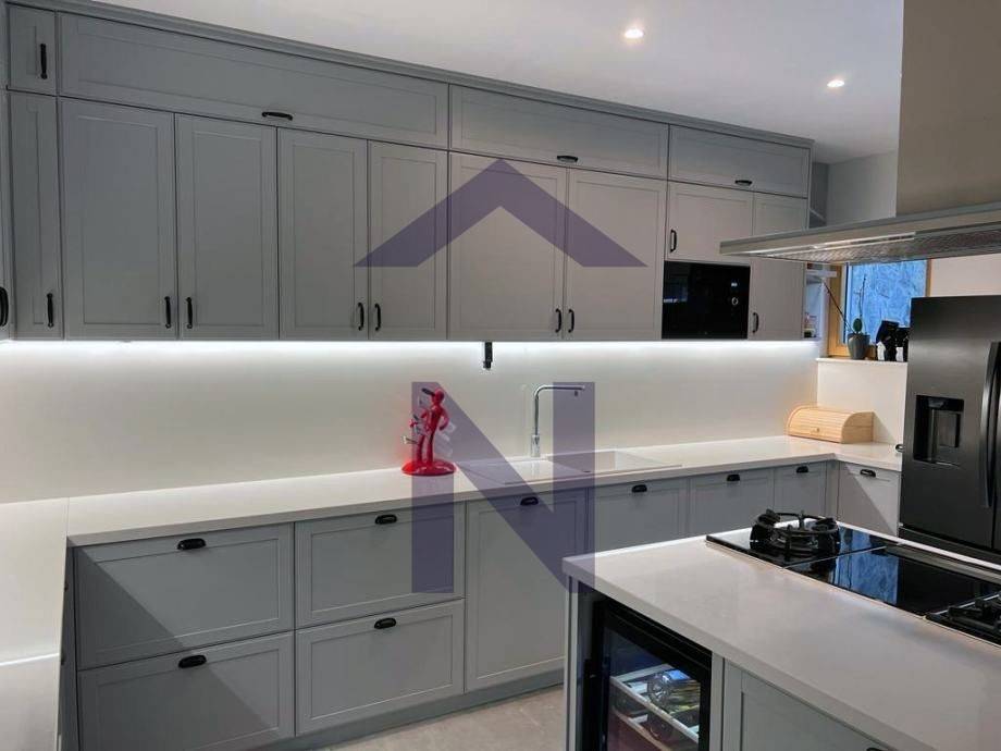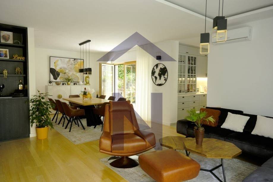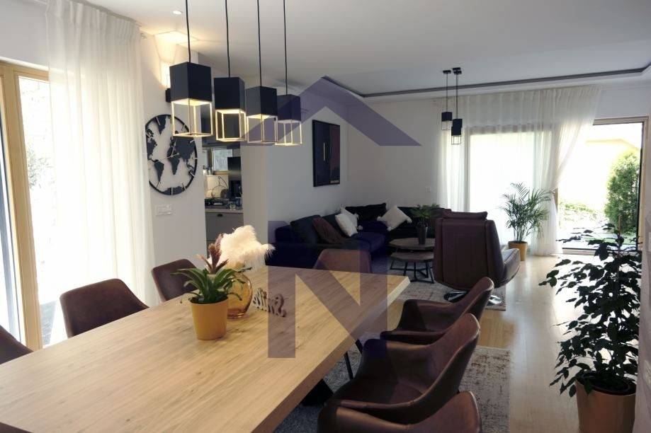 Prodaje se luksuzan stan u urbanoj vili sa tri stana, koji se sastoji od dnevnog boravka s blagavaonicom i kuhinjom, tri spavaće sobe, dvije kupaonice i wc-om, terasama i vrtom, te garažom ukupne površine 166 m2.