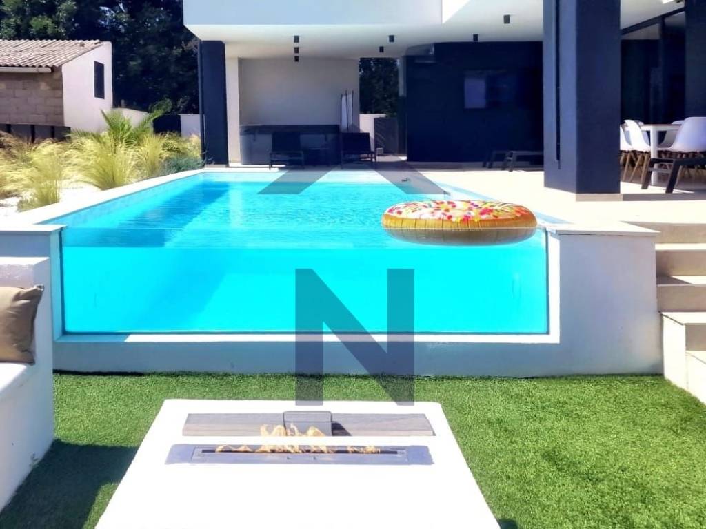 Dimenzije bazena iznose 9 x 3,5 m te je jedna strana bazena u potpunosti staklena. Kod sunčališta se nalazi atraktivni slap širine 1,5 m koji se ulijeva u bazen s 2,5 m visine. Ovaj dio vile idealan je za odmor i uživanje s pogledom na zelenilo.