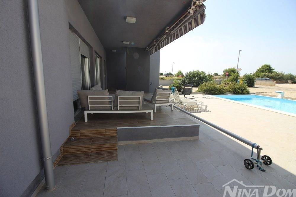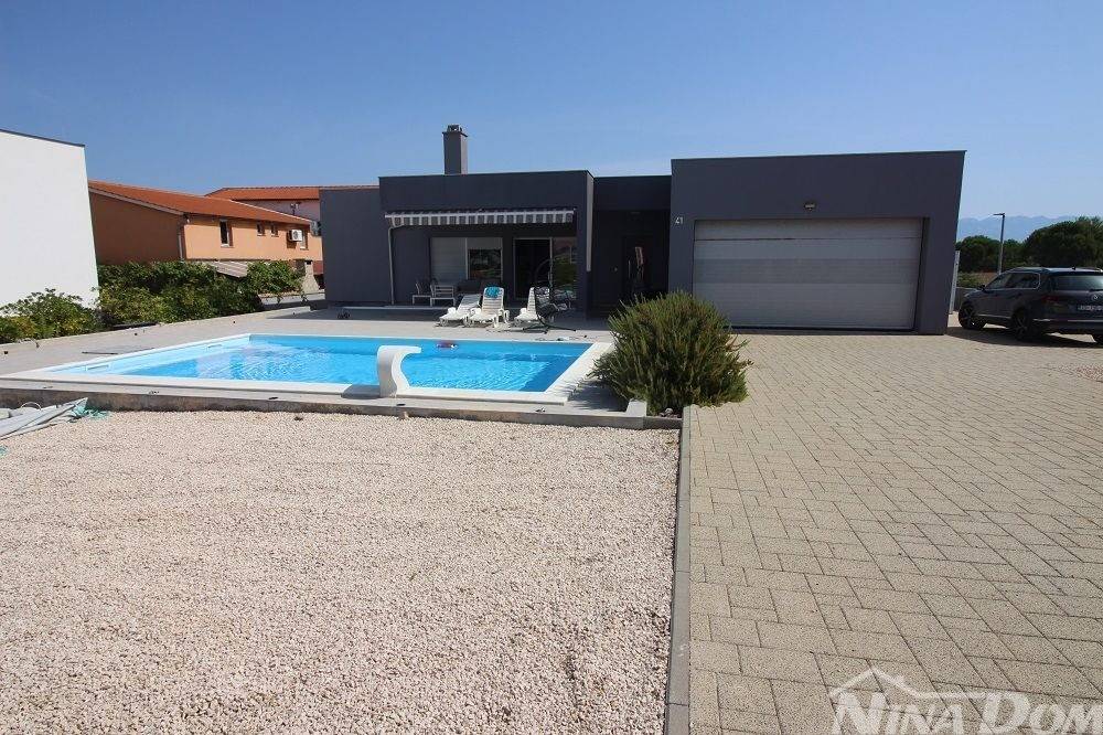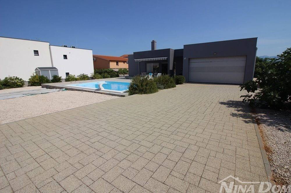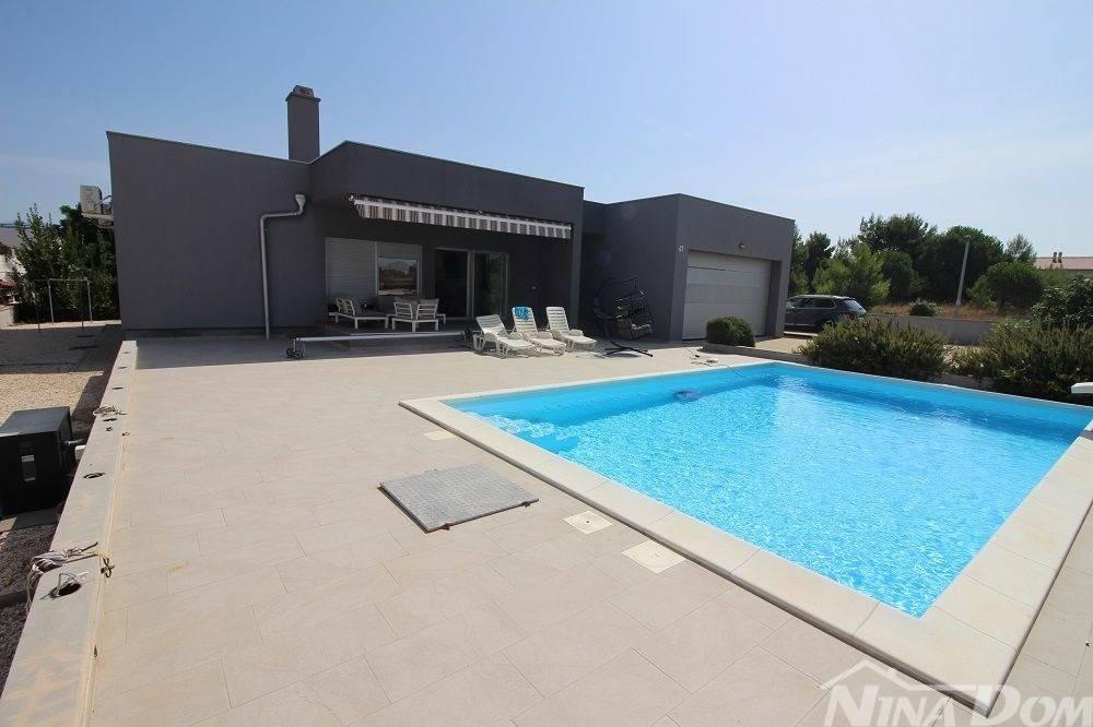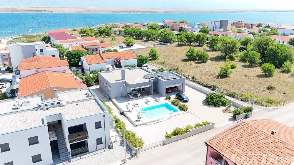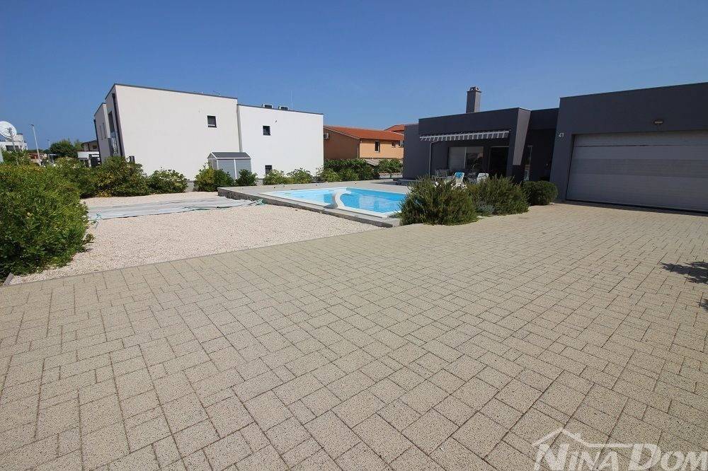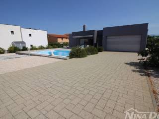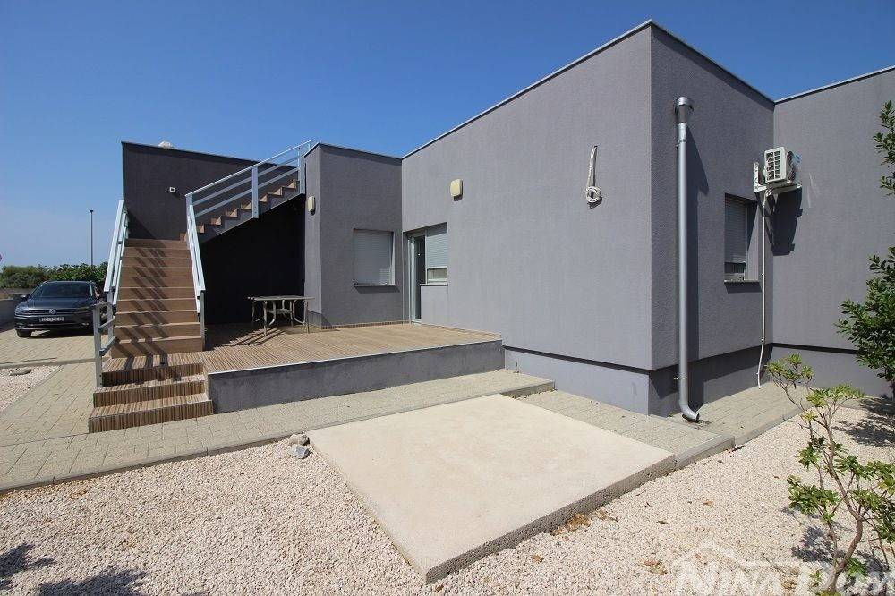 LIjepo uređena prizemnica na velikoj i prostranoj okućnici. Nekretnina veličine 283.20 bruto građevinske površine od čega neto korisnu površinu ima 186.73 m2. Veličina parcele iznosi 1034 m2 s bazenom od 40 m2, i slobodnom okućnicom 732 m2. Sastoji se od ulaza, hodnika, wc-a, blagovaone s dnevnim boravkom, kuhinja s praonicom rublja. spavaća soba s kupaonicom i garderobom, dodatne tri spavaće sobe i kupaonica. Garaža 40.50 m2. Ispod stepenica koja vode na krovnu terasu nalazi se ostava. Na krovu nekretnine postavljeni su solarni paneli. Od mora i plaže udaljena je svega 275 met.