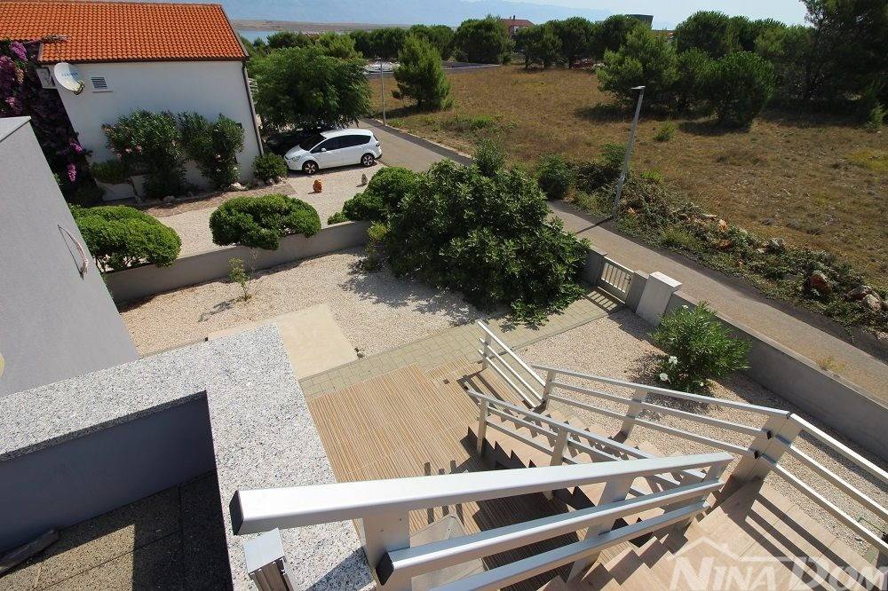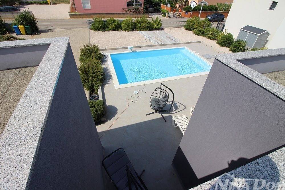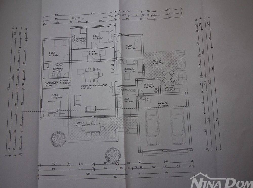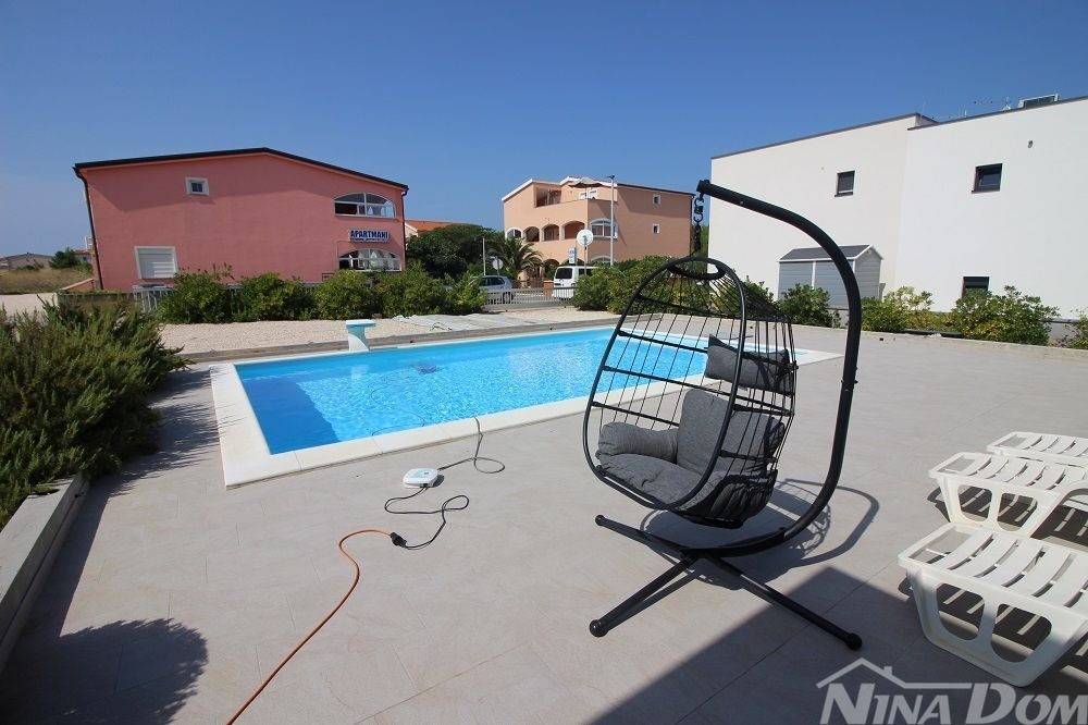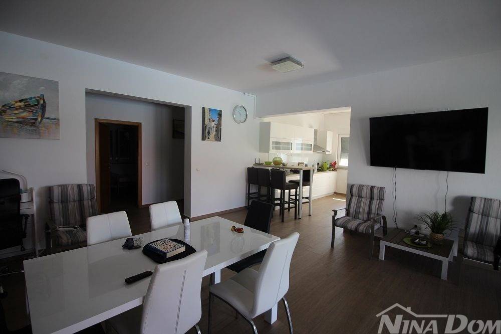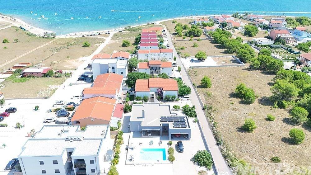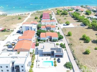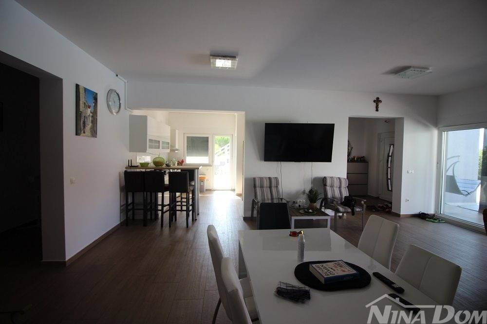 LIjepo uređena prizemnica na velikoj i prostranoj okućnici. Nekretnina veličine 283.20 bruto građevinske površine od čega neto korisnu površinu ima 186.73 m2. Veličina parcele iznosi 1034 m2 s bazenom od 40 m2, i slobodnom okućnicom 732 m2. Sastoji se od ulaza, hodnika, wc-a, blagovaone s dnevnim boravkom, kuhinja s praonicom rublja. spavaća soba s kupaonicom i garderobom, dodatne tri spavaće sobe i kupaonica. Garaža 40.50 m2. Ispod stepenica koja vode na krovnu terasu nalazi se ostava. Na krovu nekretnine postavljeni su solarni paneli. Od mora i plaže udaljena je svega 275 met.
