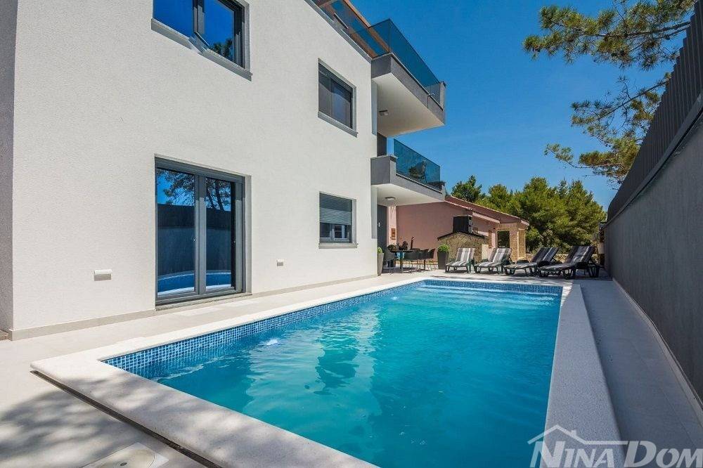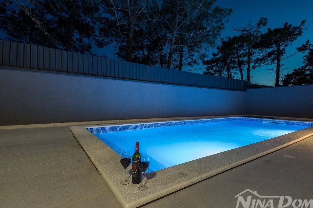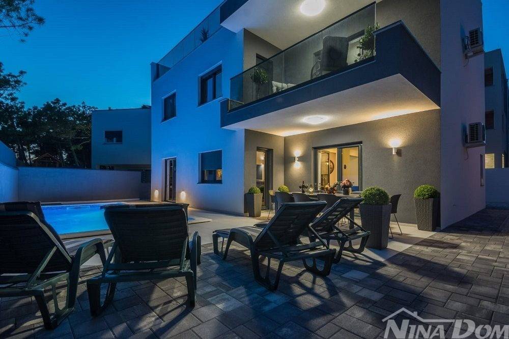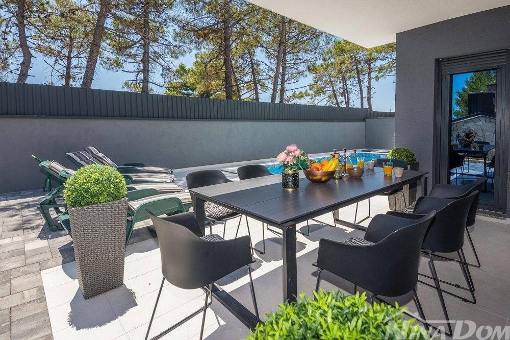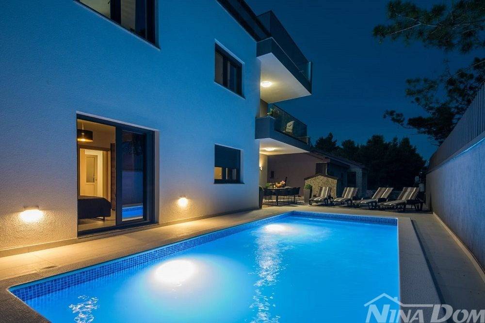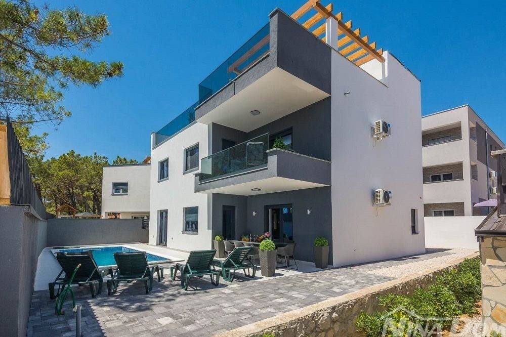 Okućnica uređena s bazenom, parkirna mjesta. Nalazi se u slijepoj ulici što joj dodatno daje dozu intimnosti gostima, prekrasan pogled na more. Od mora i plaže udaljena je 70 metara zrečne linije dok prilaznom cestom im 150 metara.
