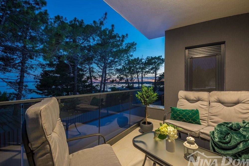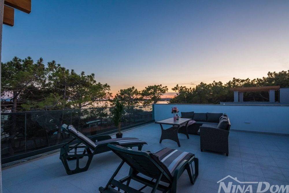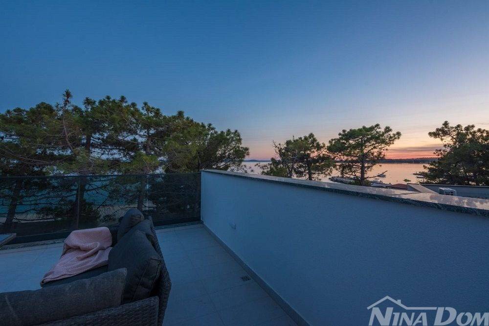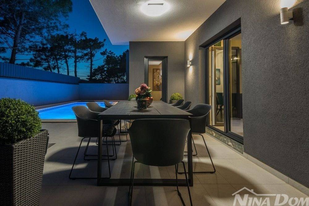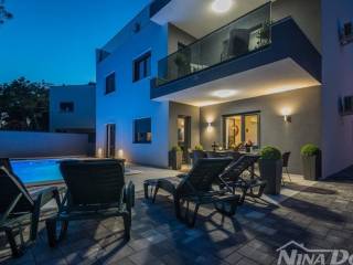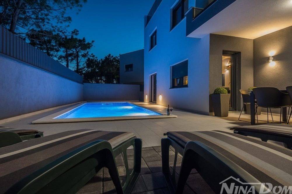 Okućnica uređena s bazenom, parkirna mjesta. Nalazi se u slijepoj ulici što joj dodatno daje dozu intimnosti gostima, prekrasan pogled na more. Od mora i plaže udaljena je 70 metara zrečne linije dok prilaznom cestom im 150 metara.