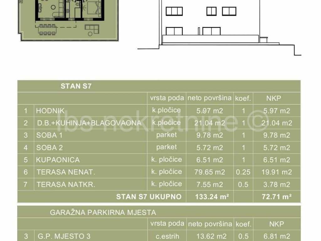 The apartment located on the third floor of a smaller residential building consists of a hallway, bathroom, two bedrooms, living room with kitchen and dining room and a terrace surrounded by the entire apartment of 87.20 m2.