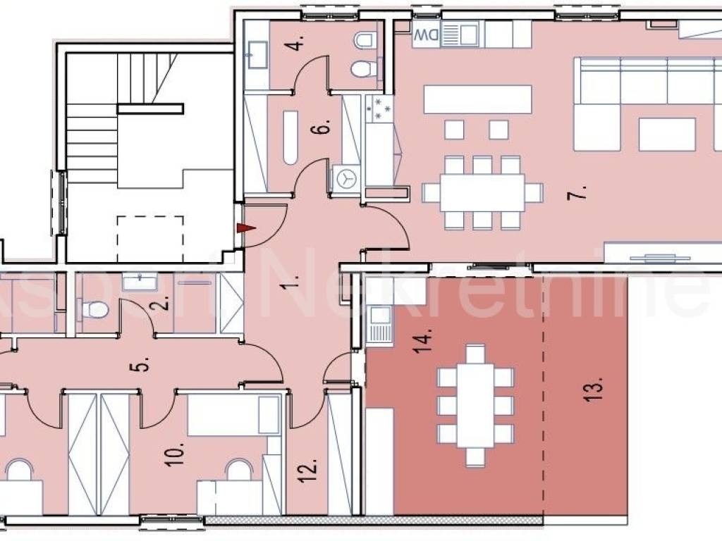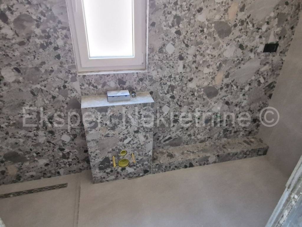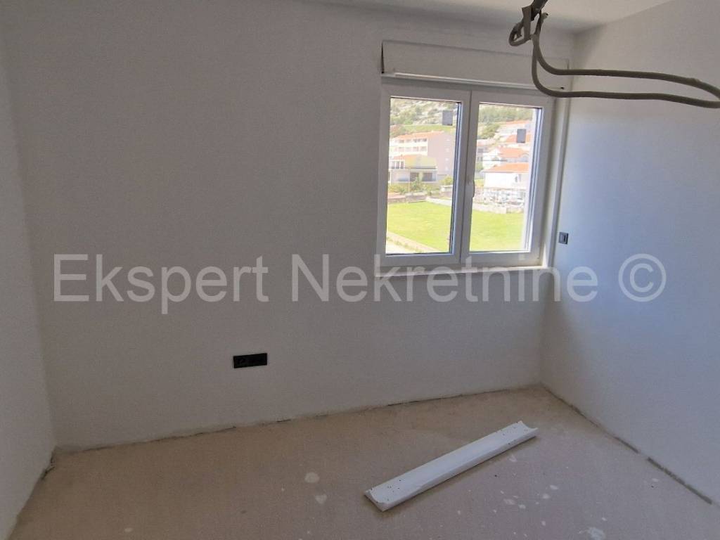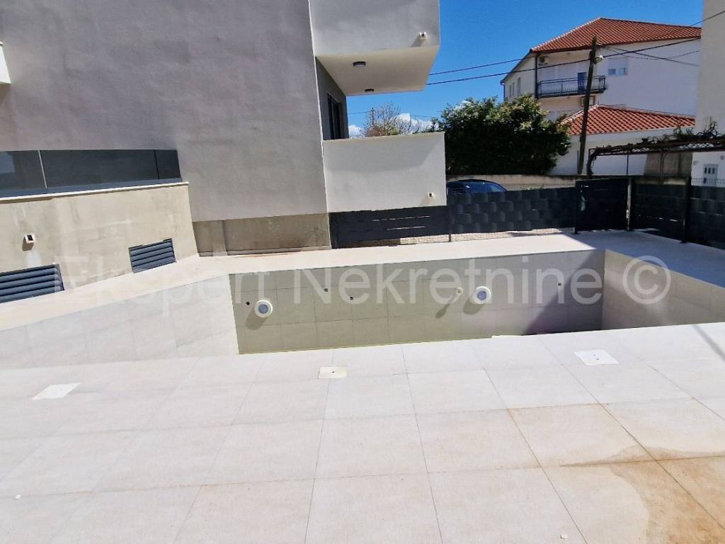 Seget Donji, luxurious penthouse of 174 m2 in a new building with a swimming pool and an elevator, on the 4th floor, with a panoramic view of the sea in a building in an excellent and quiet location only 120 m from the sea and the beach. The apartment has three bedrooms, one of which has a dressing room, a hallway, 2 bathrooms, a toilet, a dressing room, a laundry room, an entrance hall, a kitchen with a dining room and a large living room, and two large loggias (29 m2 and 26 m2) from which it has a beautiful panoramic view of the sea.The apartment has two garages on the ground floor. It is possible to purchase an additional parking space in the garage for EUR 15,000.00).Excellent and quiet location, only 120 m away from the sea and a well-kept beach. Quality construction (PVC windows with triple glazing, large sliding walls, elevator, electric shutters, mosquito nets, underfloor heating throughout the apartment, air conditioning, quality ceramics, etc.). The price of the apartment includes VAT, so the buyer does not pay the 3% real estate tax. The apartment is ready to move in soon.Ownership is in order. For more information and reservations, contact the agency.