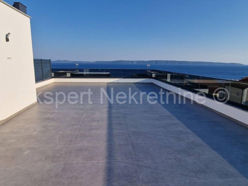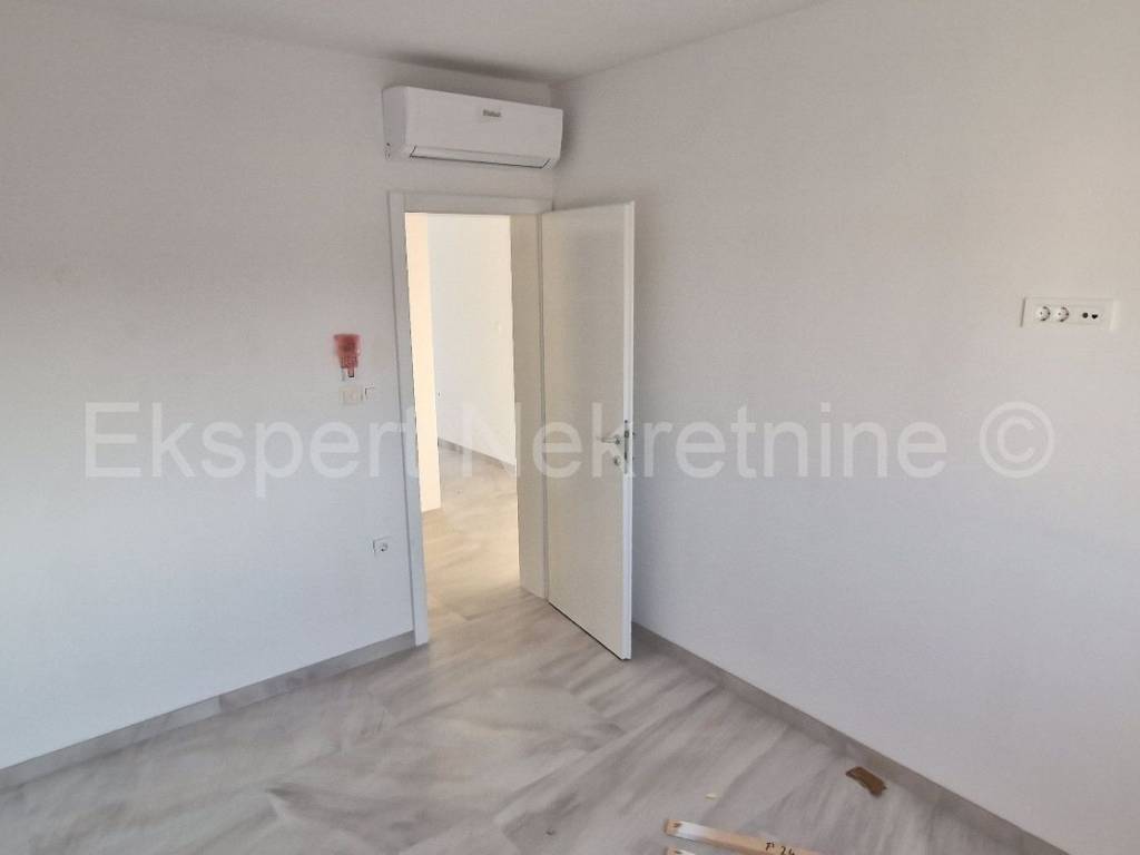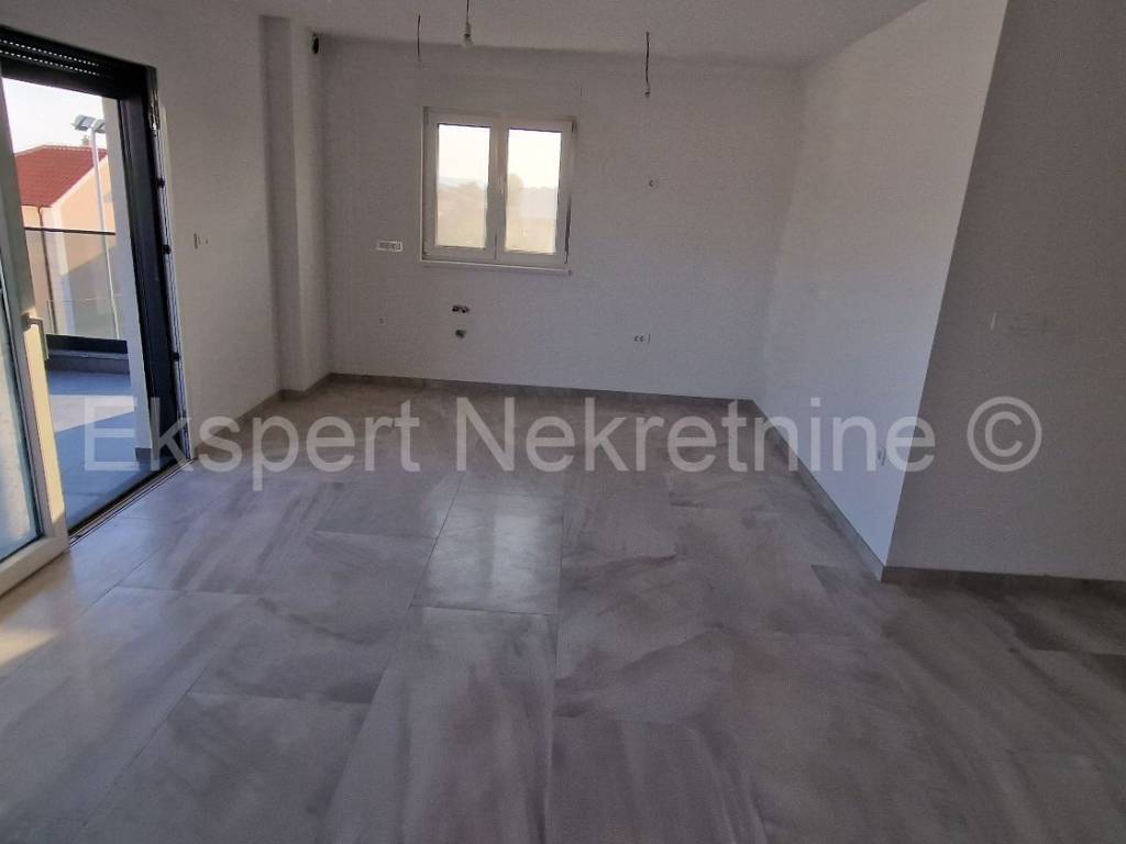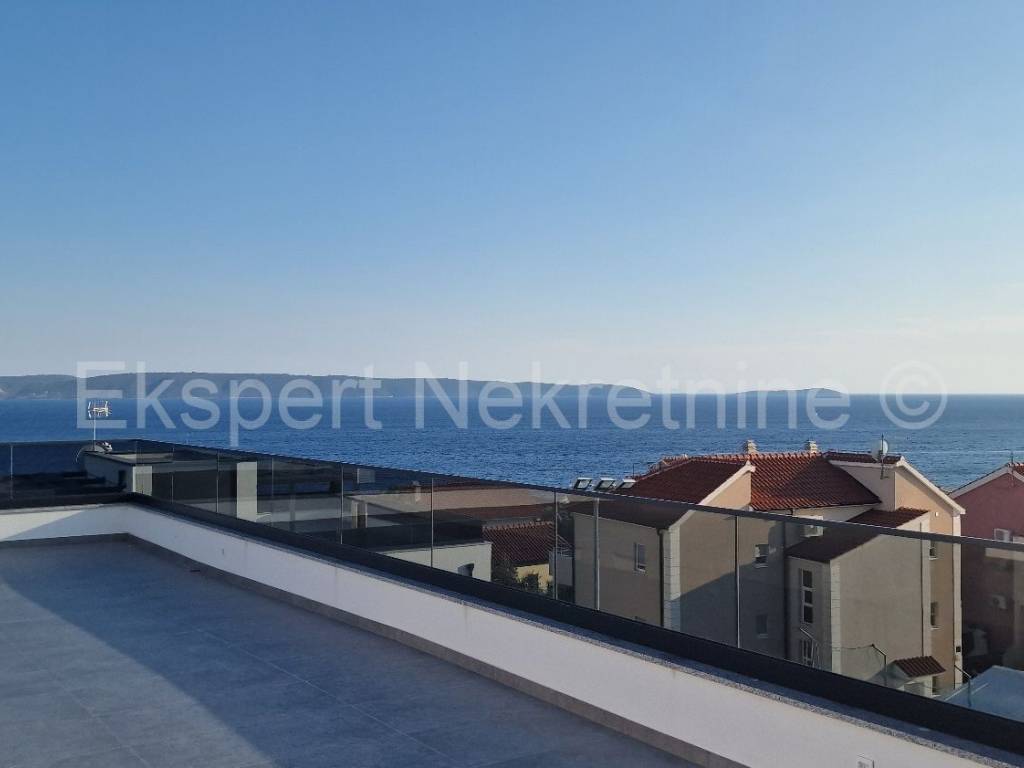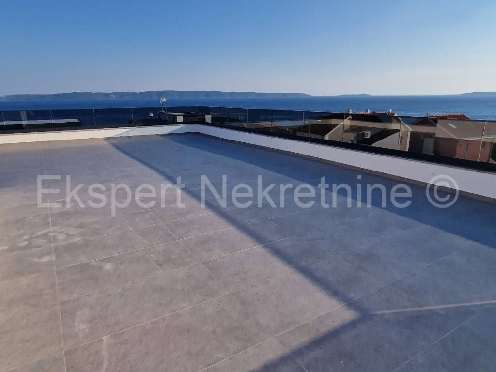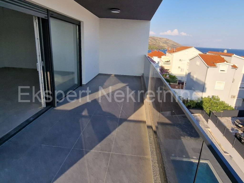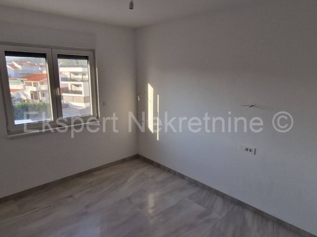 Čiovo, Okrug Gornji, comfortable two-bedroom apartment 73 m2 + roof terrace 74 m2 in a new building with a swimming pool in a smaller building with only 6 apartments. The apartment is on the second floor of the building, oriented north-west-south, and consists of two bedrooms, bathroom, hallway, pantry, kitchen with dining room and living room, a large balcony (13 m2) and a roof terrace of 73 m2 with an open view of the sea. The apartment also has one outdoor parking space.The building is located in a TOP location, 160 m from the sea and a large well-organized beach (copacabana) and also from all other amenities (shops, restaurants, cafes, etc.). Quality construction (quality ceramics, underfloor heating, air conditioning, mosquito nets, PVC joinery, etc.). The building is in the phase of starting rough construction works, and the planned completion is the summer of 2025. Ownership in order.For more information, contact the agency.