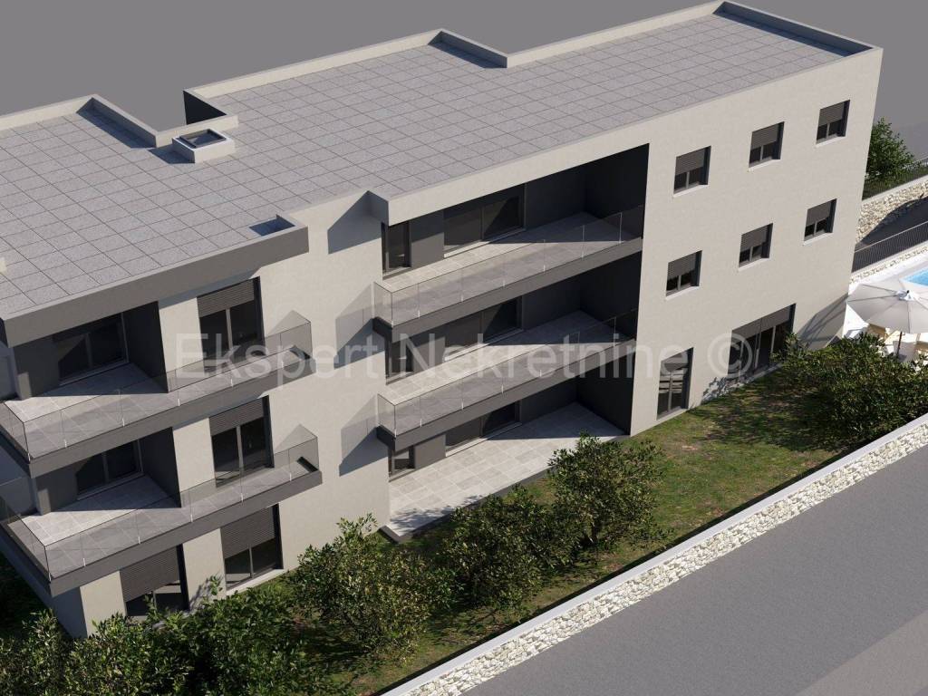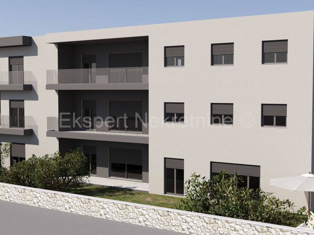 Seget Vranjica, comfortable three-room apartment 129 m2 (109 m2 + 20 m2 loggia) on the second (last) floor of a new building with a panoramic view of the sea and islands. The orientation of the apartment is north-south-east. The apartment has three bedrooms each with a bathroom, kitchen, a dining room and a large living room and a large loggia (20m2) with a panoramic view of the sea and the islands, from which the apartment is approx. 350m away. The apartment has one outdoor parking space.