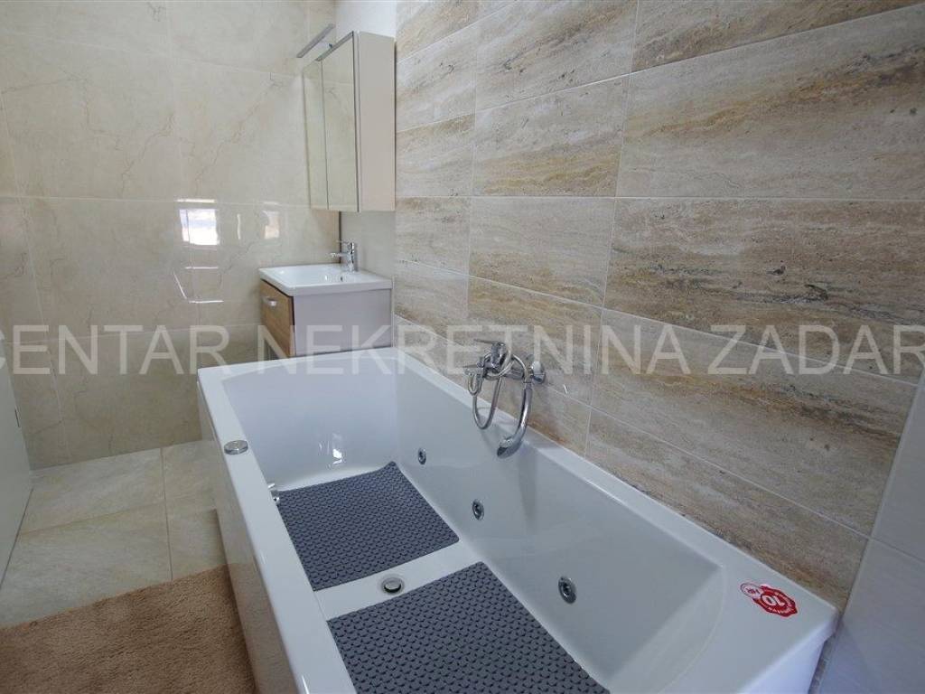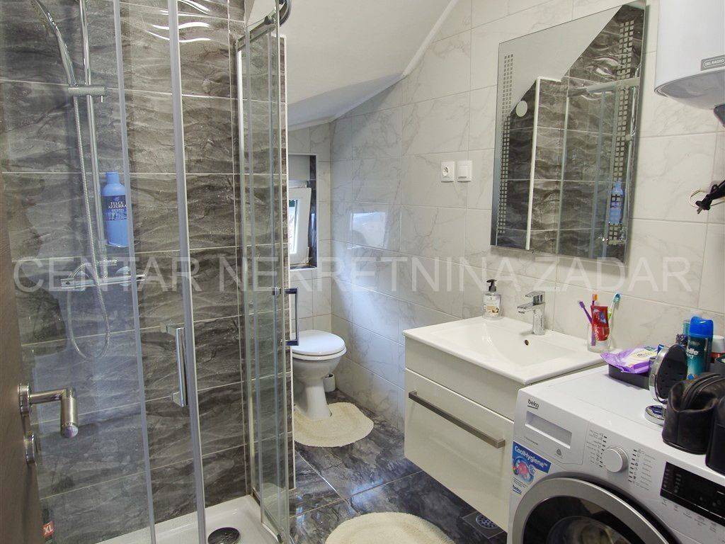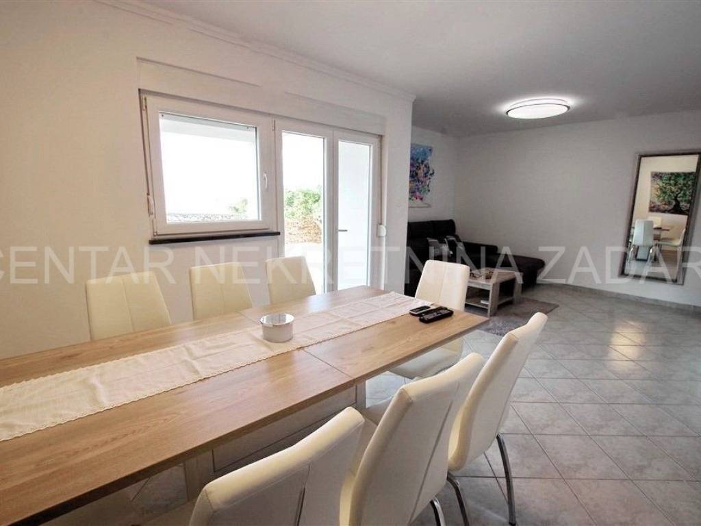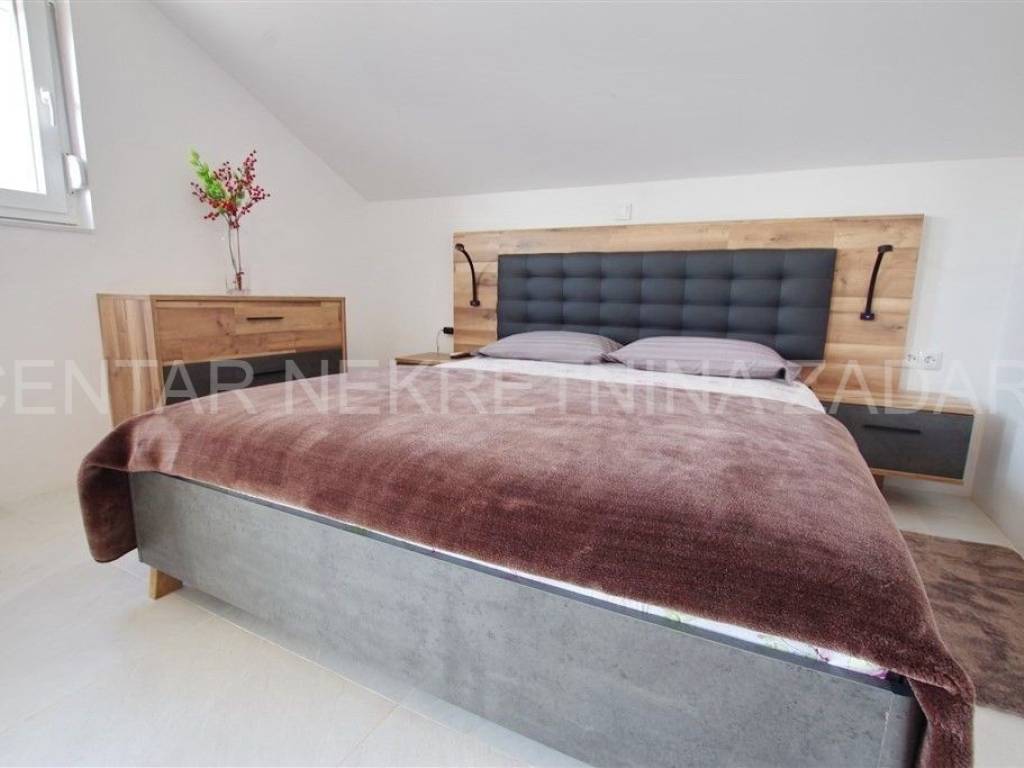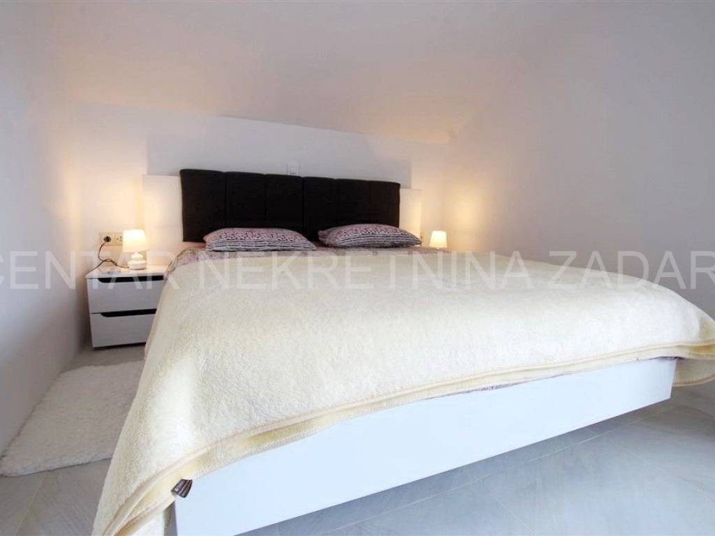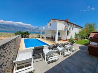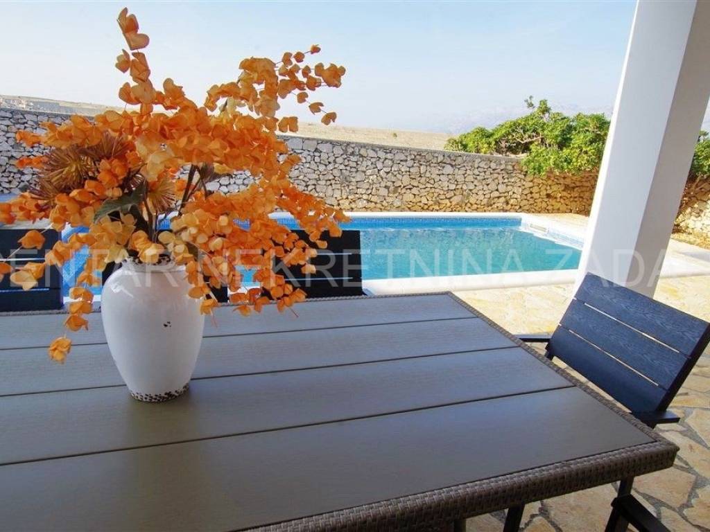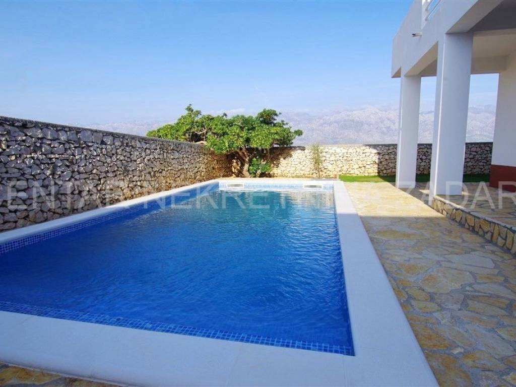 The living area of 160 m is distributed on the ground floor and high attic. In the ground floor there are a kitchen, large living room with dining area, one bedroom with private bathroom and an additional bathroom. The living room has access to a covered garden terrace with a pool. In the high attic there are three bedrooms, two bathrooms and two terraces with view overlooking the sea and Velebit. All rooms are air conditioned, in the attic there is underfloor heating, and in the living room it is possible to install a fireplace.
