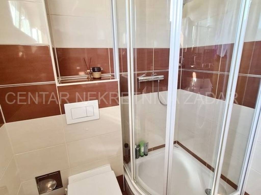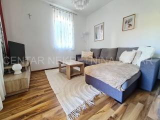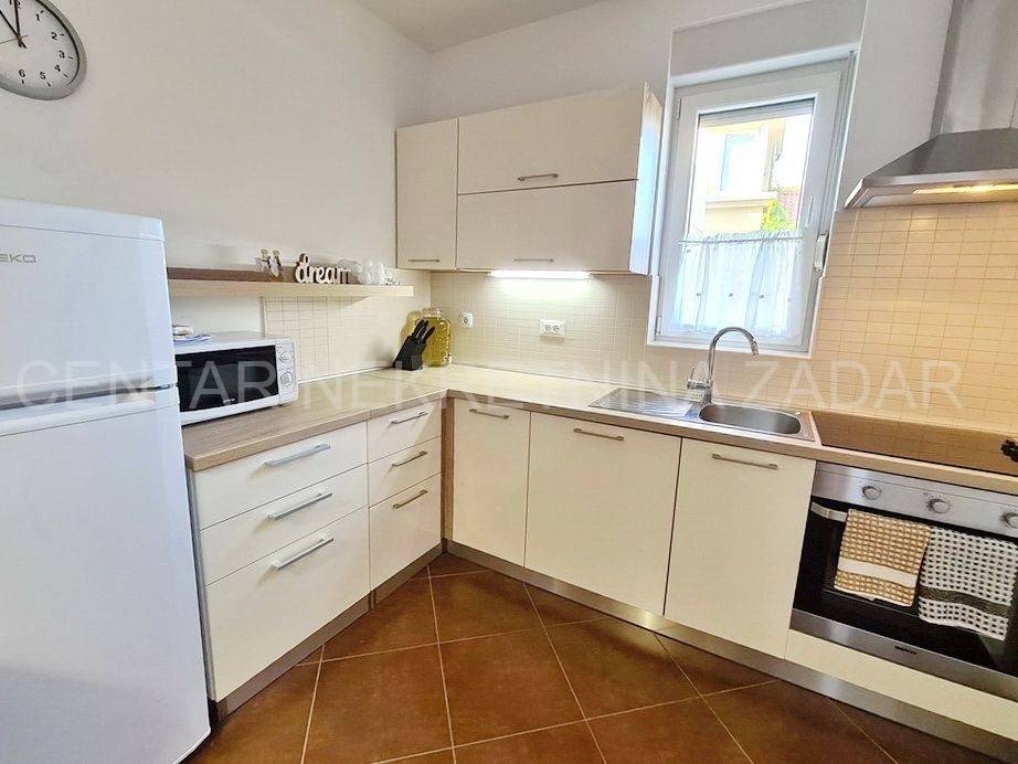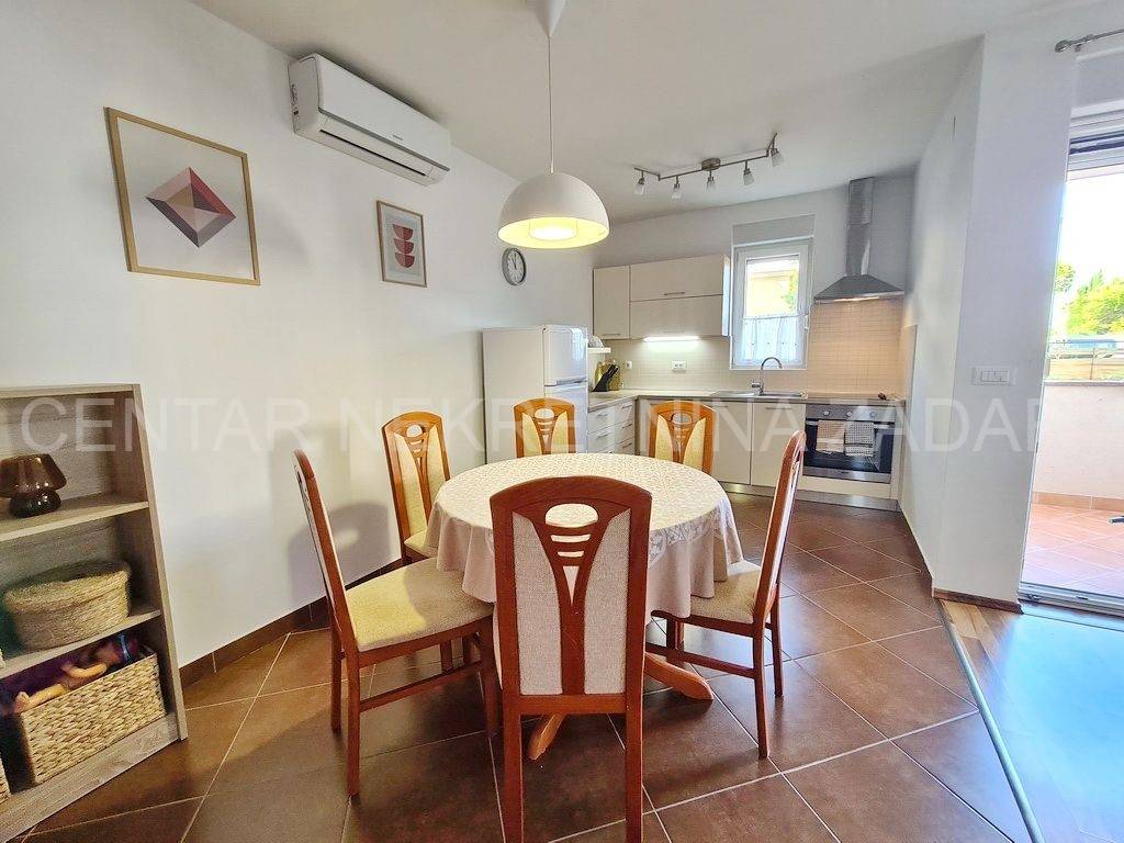One bedroom apartment for sale, located in a quiet part of Pakoštane. It is located on the ground floor of a smaller building with only six residential units. It has an area of 44.81 m and consists of an entrance hall, a living room, a kitchen with dining area, one bedroom, a spacious bathroom and a covered terrace. There is also one parking space and a garden of 104 m.