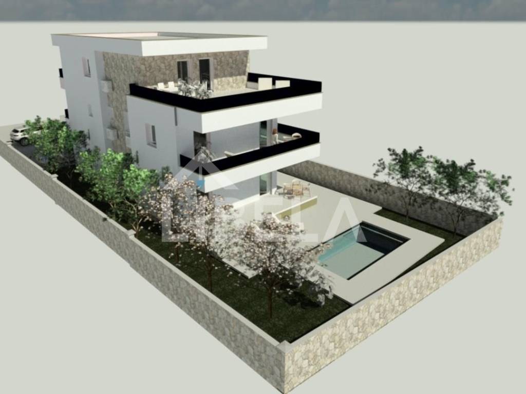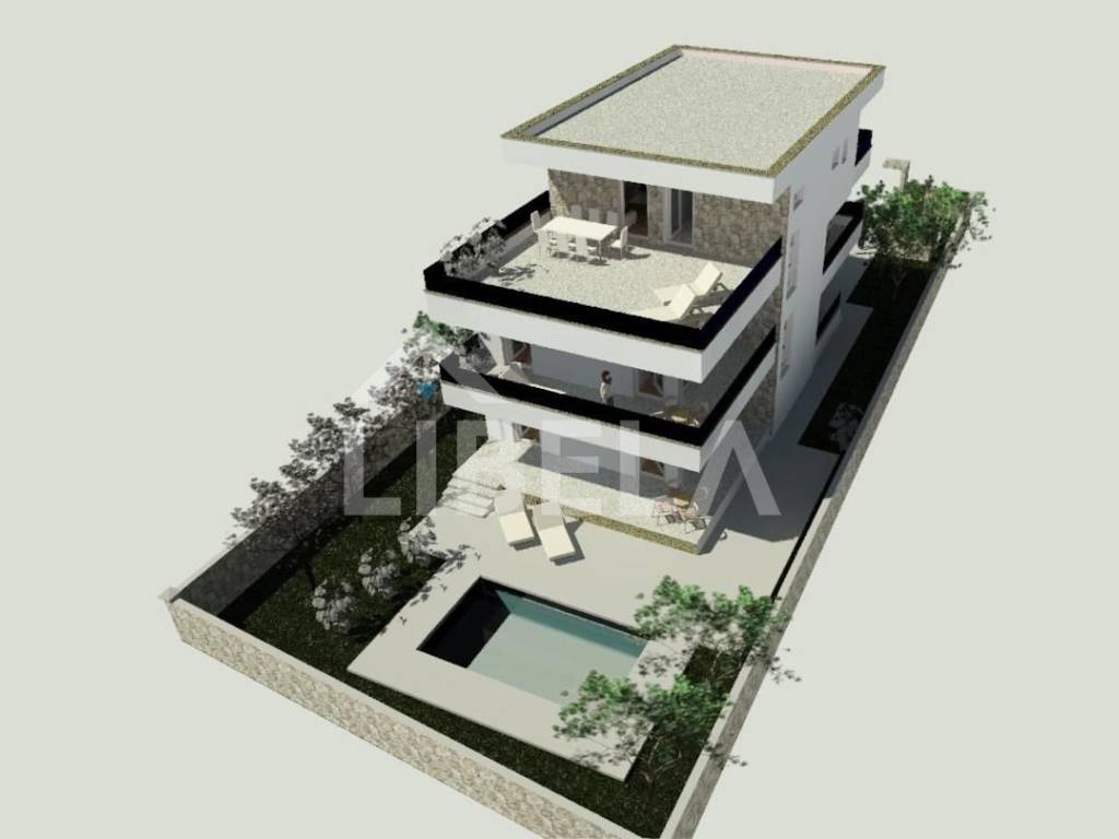 Zemljište je površine 576 m2, na kojem se trenutno nalazi 10 stabala maslina starih preko 40 godina, prilazni put do zemljišta je osiguran i ucrtan ali još nije asvaltiran zbog radova na infrastrukturi će i to biti uskoro riješeno.Teren je ravan i pravokutnog je oblika dimenzija:širine 17m i dužine 34m.