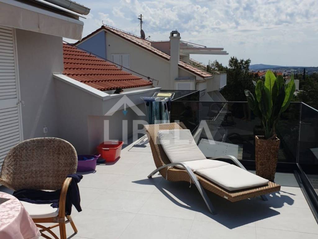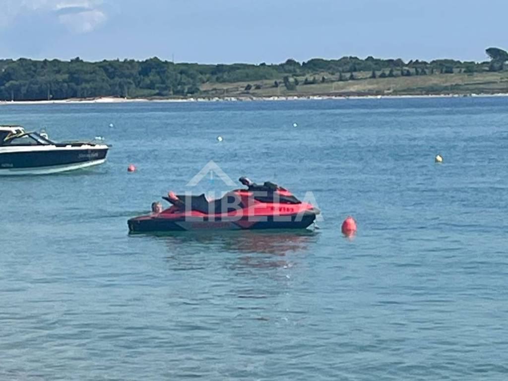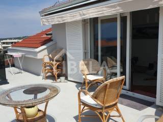 Apartman se nalazi u mirnom dijelu naselja, u potkrovlju objekta (3. kat) u kojem se nalazi devet apartmana, te je to jedini apartman na trećoj etaži. Apartman ima veliku nenatkrivenu terasu od 35 m2 sa pogledom na more, ulazni hall, dvije spavaće sobe, kupaonica, wc, kuhinja, blagovaonica i dnevni boravak te mu pripada parkirališno mjesto od 18 m2. Klimatiziran je i vrhunski uređen, te sav namještaj i uređaji ostaju u apartmanu i ulaze u cijenu. U cijenu također ulazi i jet-ski te dvije bove, jedna za jet-ski u prvom redu, te druga za čamac u drugom redu. Stanu također pripadaju i dvije ostave od kojih je svaka 10 m2 bruto površine, što zapravo zajedno sa terasom daje veću površinuapartmana (80 m2 stambene + 20 m2 bruto ostava + 35m2 terasa).