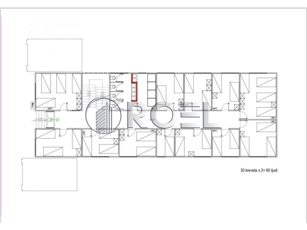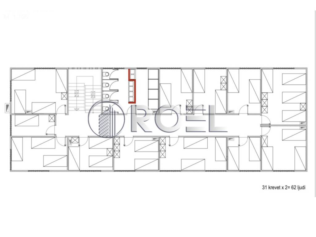 Karakteristike objekta: Kapacitet: 100 radnika Površina: 600 m Broj soba: 24 Sanitarni čvorovi: 10 WC-a (na zasebnoj etaži) Zaseban objekt: Da Zaključani prostor za parkiranje skutera