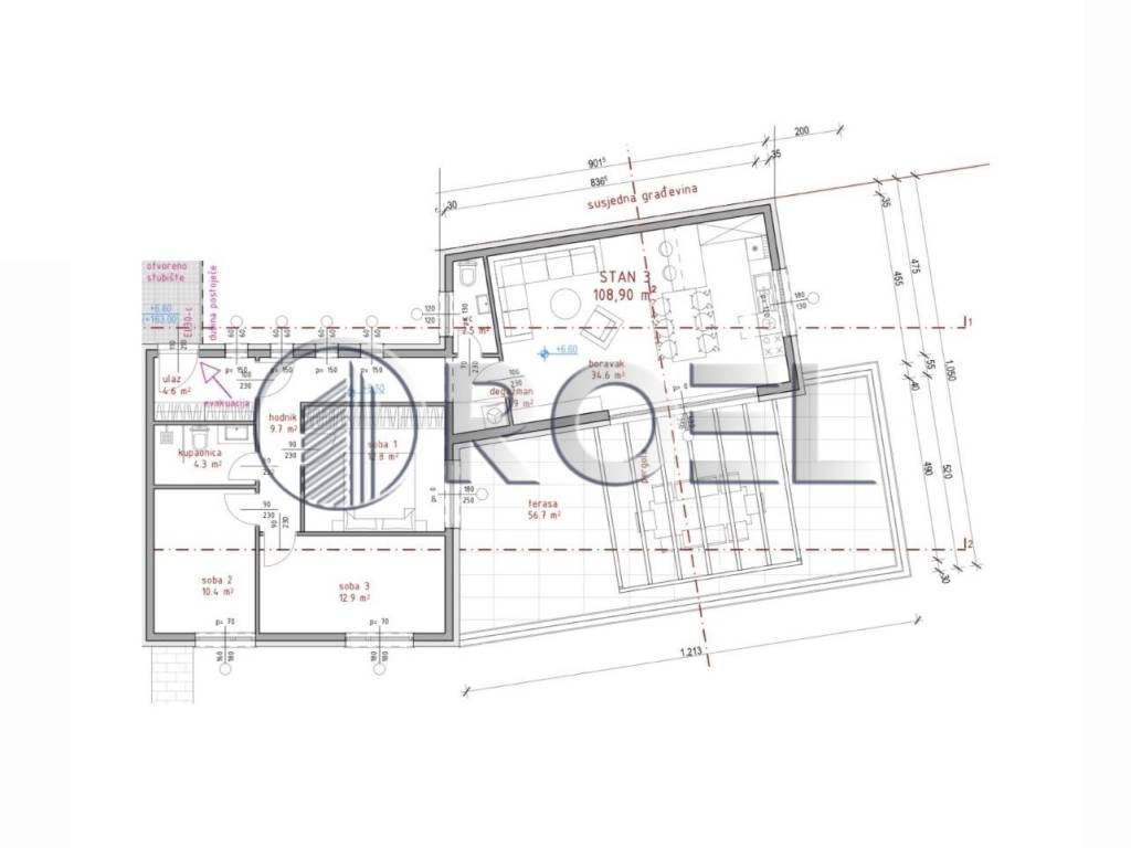 Četverosobni penthouse NKP 123 m2, smješten na 2. katu luksuzne novogradnje na Medveščaku. Sastoji se od ulaznog hodnika, tri spavaće sobe, jedne kupaonice s wc-om, jednog toalet, ostave, open space dnevnog boravka, kuhinje i blagovaone s izlazom na prostranu terasu (56.7 m2, odnosno neto 13.92 m2) djelomično natkrivenu s pergolom.