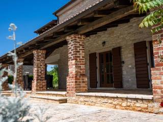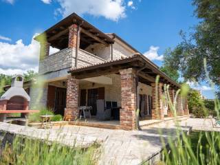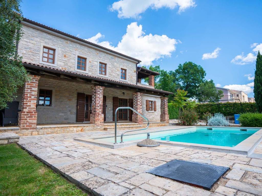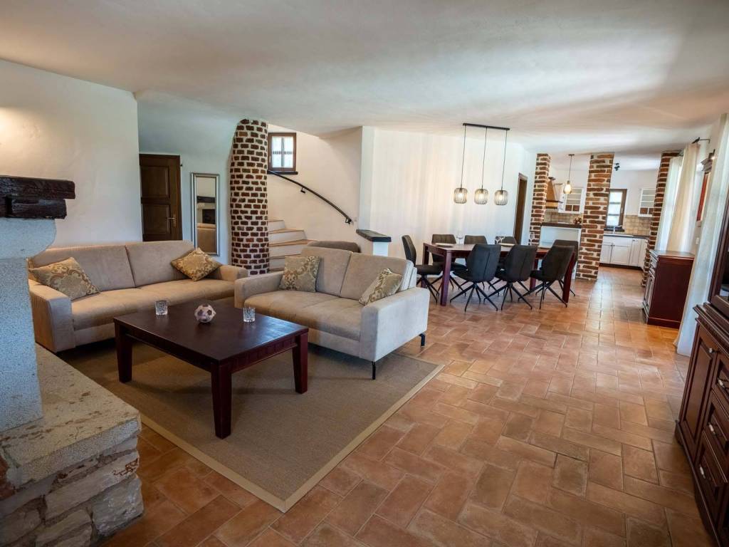 Prodaje se prostrana vila s pažljivo osmišljenim interijerom koji spaja rustikalni ugođaj s modernim komforom. Sobe su obložene daščanim podovima, dok su ostali prostori popločani keramičkim pločicama visoke kvalitete. Stropovi su ukrašeni dekorativnim drvenim gredama, a u središtu dnevnog boravka nalazi se otvoreni kamin obložen dekorativnim kamenom koji unosi toplinu i karakter u prostor.