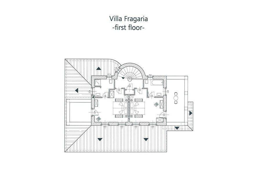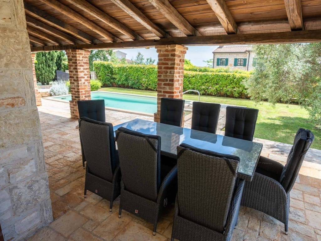 Vila se prostire na prizemlju i katu. Otvoreni koncept dnevne zone objedinjuje potpuno opremljenu kuhinju, blagovaonicu za osam osoba i udoban dnevni boravak, stvarajući funkcionalan i ugodan prostor za druženje i opuštanje tijekom cijelog dana. Namještaj kombinira rustikalne i moderne elemente, što interijeru daje poseban karakter i sofisticiranost.
