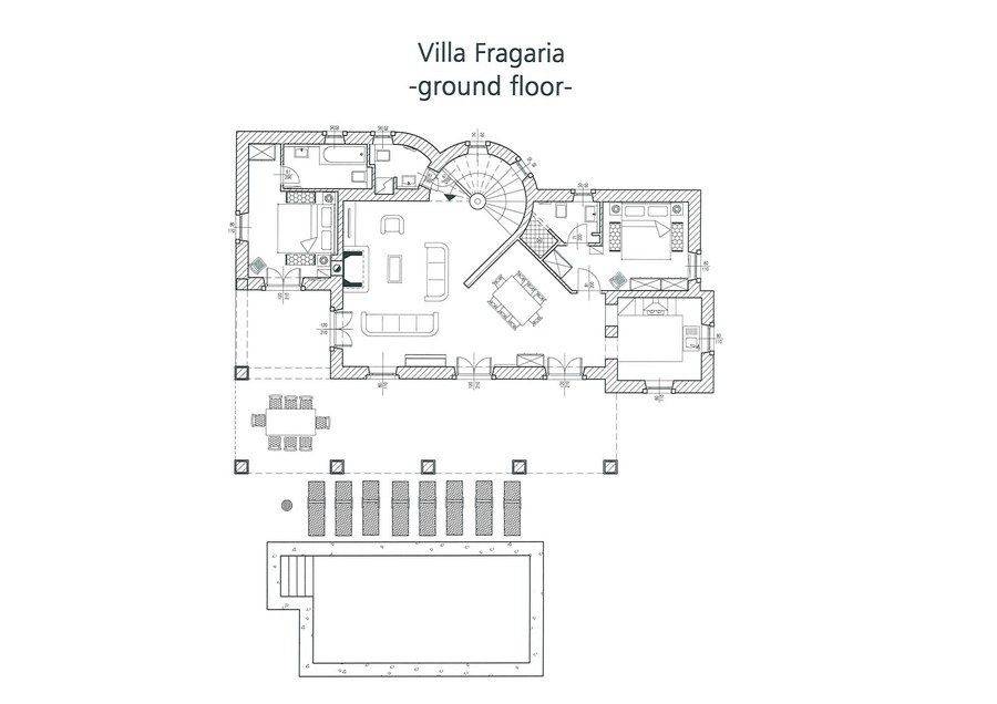 U prizemlju se nalaze dvije spavaće sobe. Jedna ima vlastitu kupaonicu i pogled na mirno stražnje dvorište, dok druga ima zaseban ulaz s natkrivene terase te pogled na bazen i dvorište. Ova soba također ima kupaonicu s kadom.