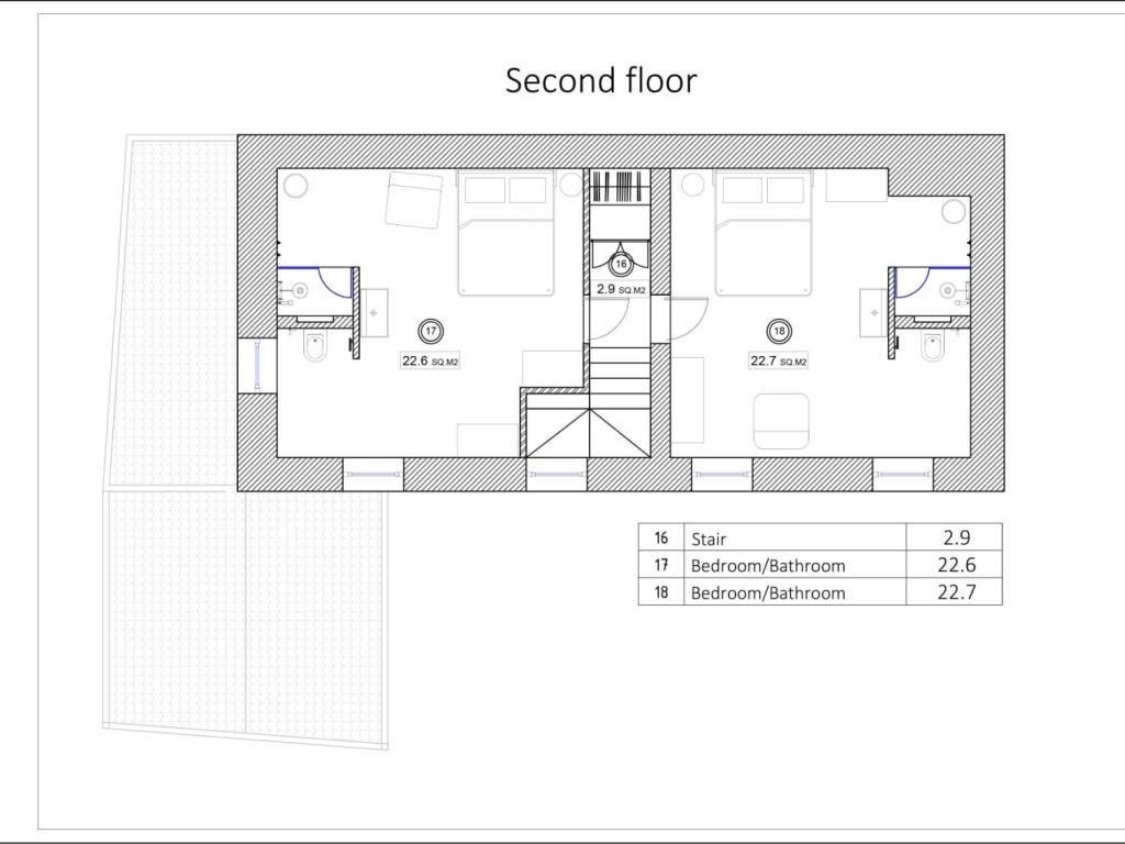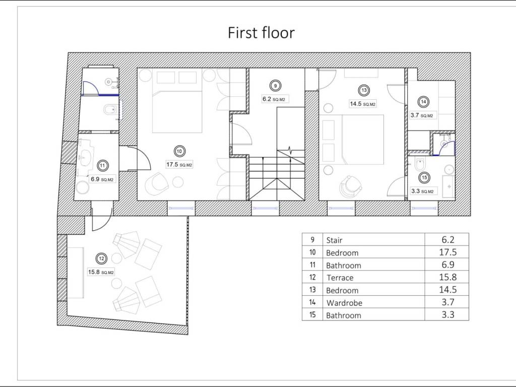On the ground floor there is a living room, a kitchen with a dining room and a guest toilet.An internal staircase leads to the first floor, where there are two beautifully decorated bedrooms, each with its own bathroom. One of the bedrooms has access to a covered terrace, perfect for enjoying quiet moments outdoors.The high attic contains two additional bedrooms, each with its own bathroom, providing privacy and comfort for family and guests.