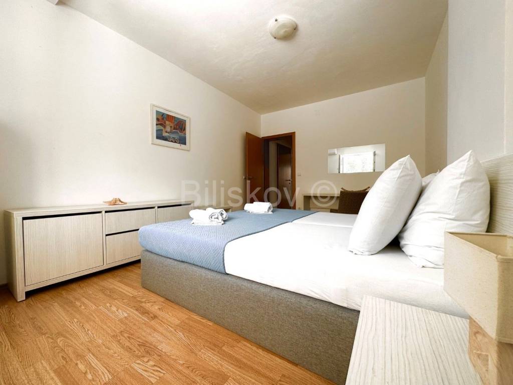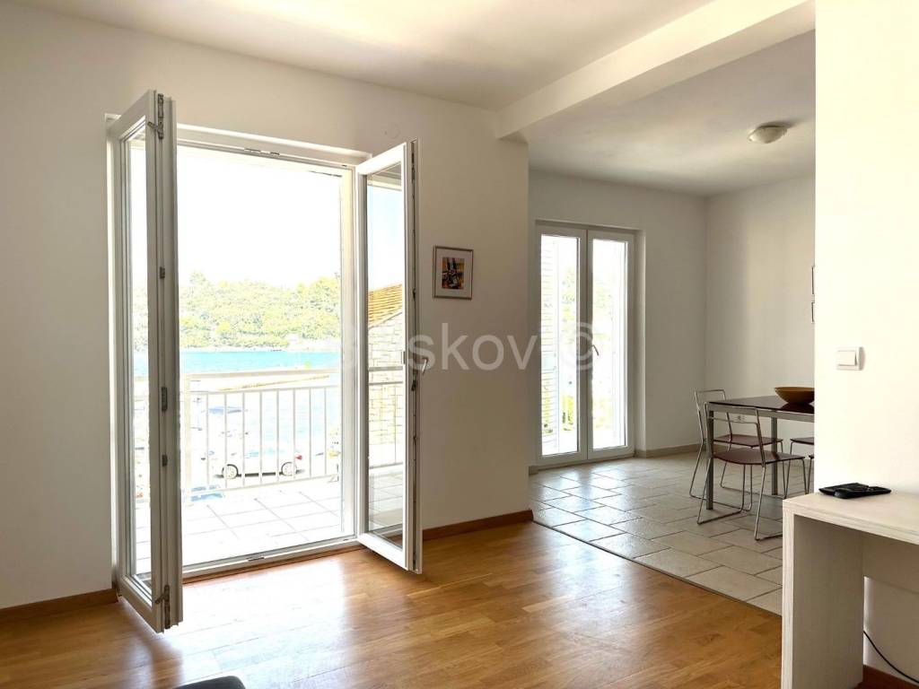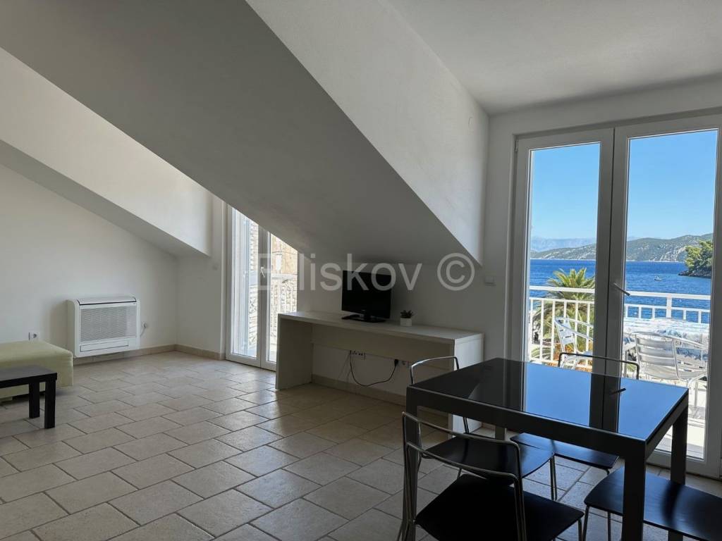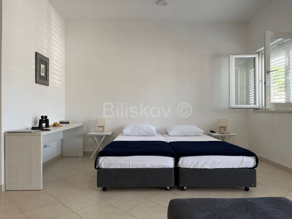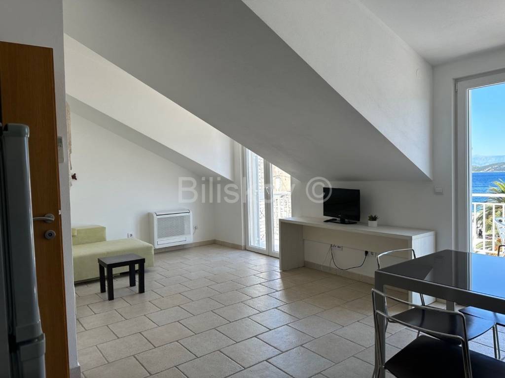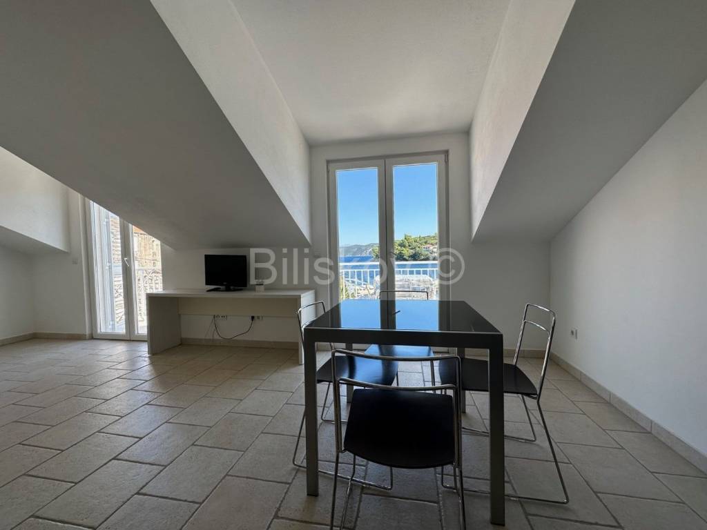 On the ground floor there is a spacious studio apartment with a terrace, an indoor fireplace and a laundry room, and on the first floor and in the high attic there is one comfortable two-bedroom apartment. Each apartment has a balcony with an open view of the entire bay.