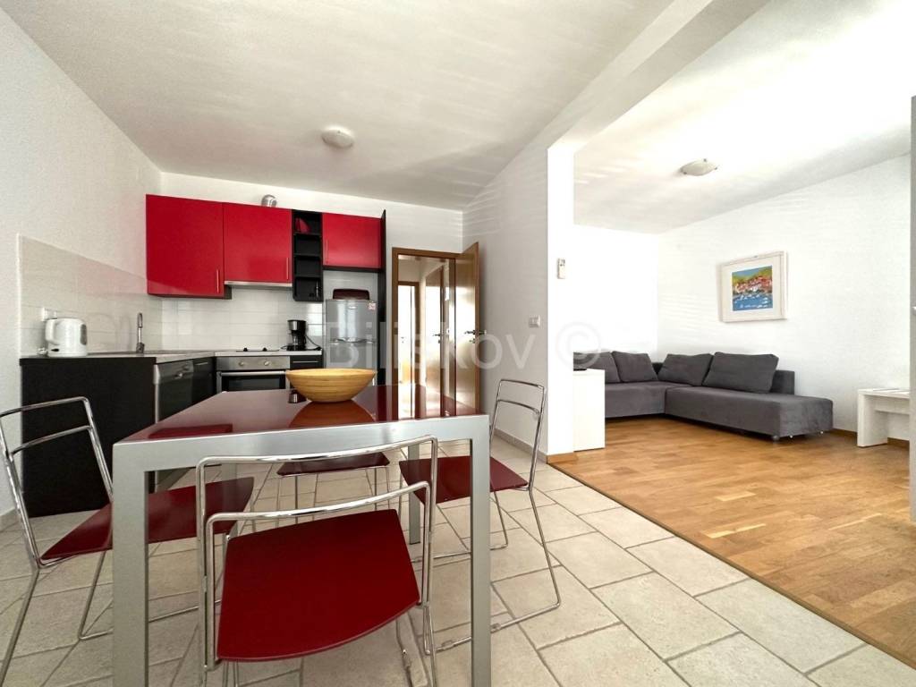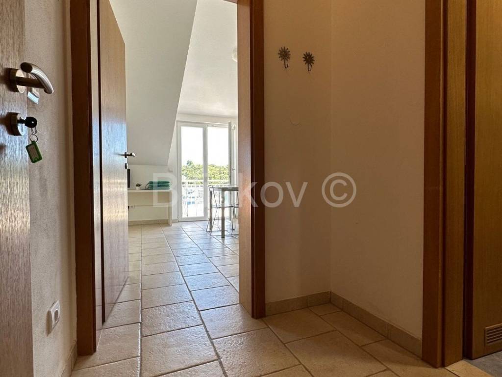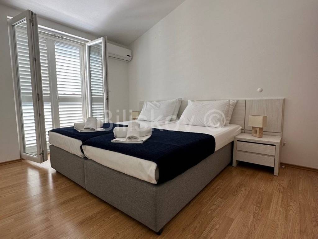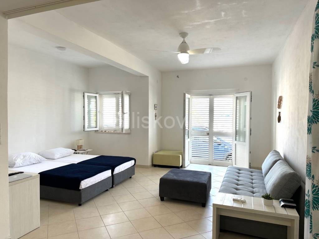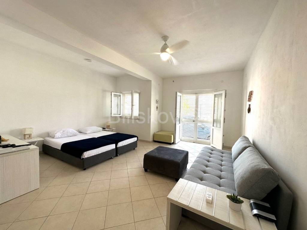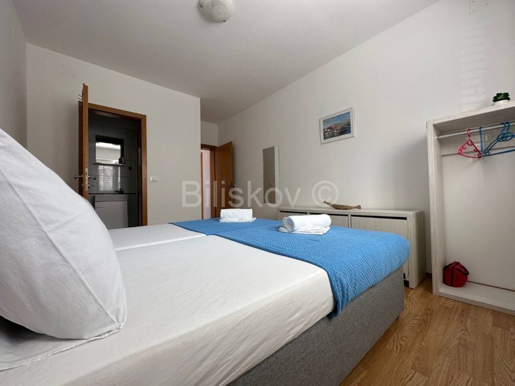 On the ground floor there is a spacious studio apartment with a terrace, an indoor fireplace and a laundry room, and on the first floor and in the high attic there is one comfortable two-bedroom apartment. Each apartment has a balcony with an open view of the entire bay.