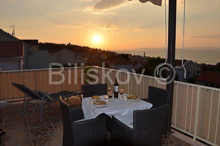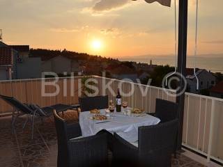 The apartment on the third floor is 54m2 with a 25m2 terrace. It consists of two bedrooms, a living room with a dining room and a kitchen, and a bathroom with a toilet and a shower. Beautiful panoramic sea view from the terrace.