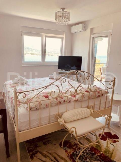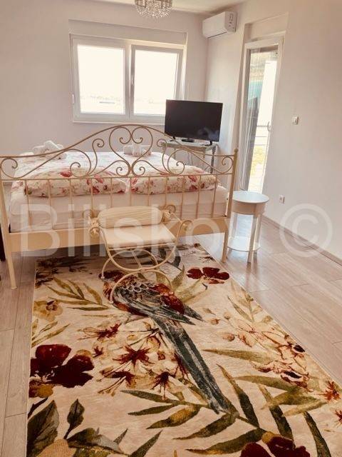 Opremljen inverter klima uređajem,novim, vrhunskimdizajnerskim krevetima sa visokokvalitetnim madracima i blagavaonskim stolovima od tikovine te dizajnerskim komodama i novim TV uređajimau svakoj sobi.